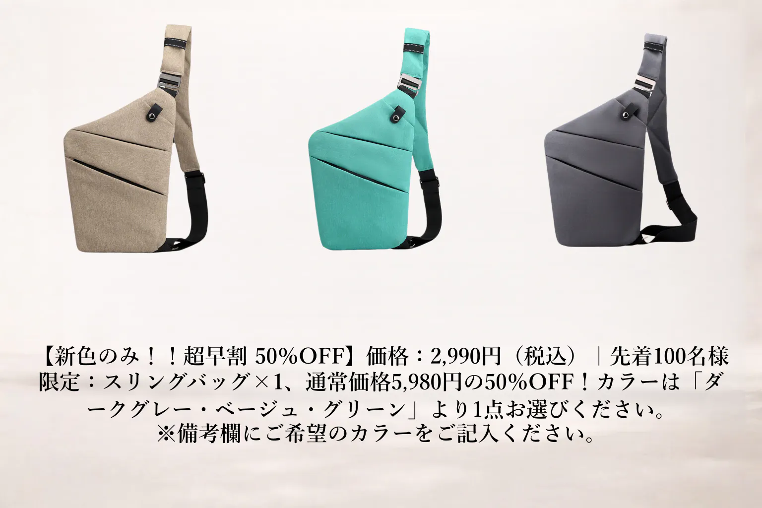 通常価格5,980円の50%OFF!カラーは「ダークグレー・ベージュ・グリーン」より1点お選びください。