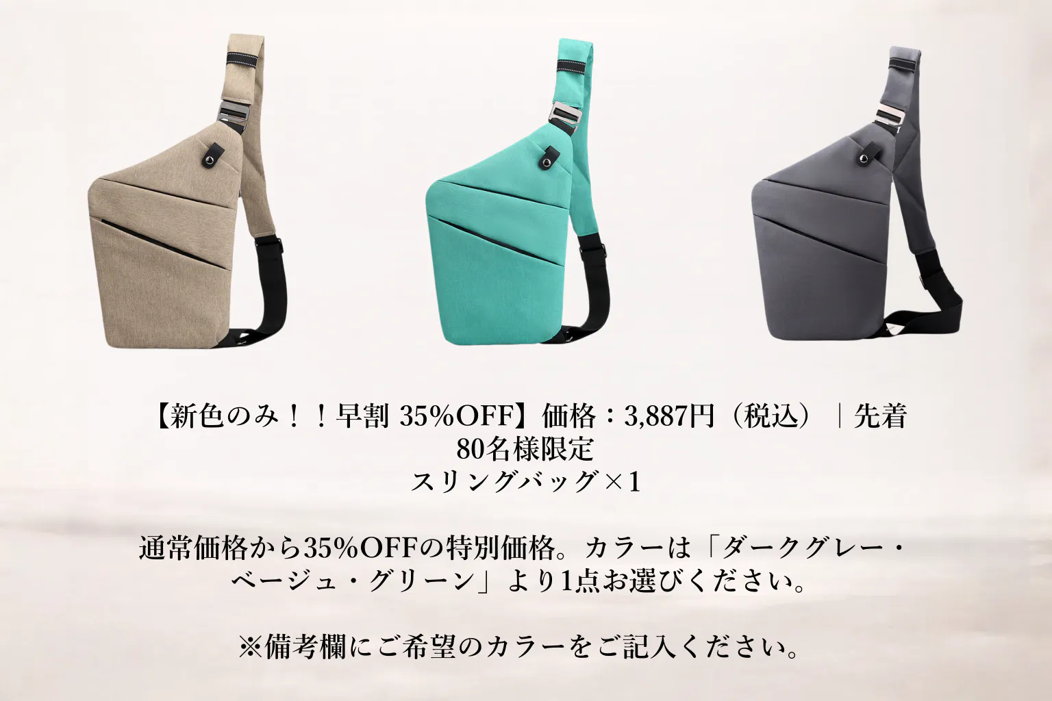 通常価格から35%OFFの特別価格。カラーは「ダークグレー・ベージュ・グリーン」より1点お選びください。