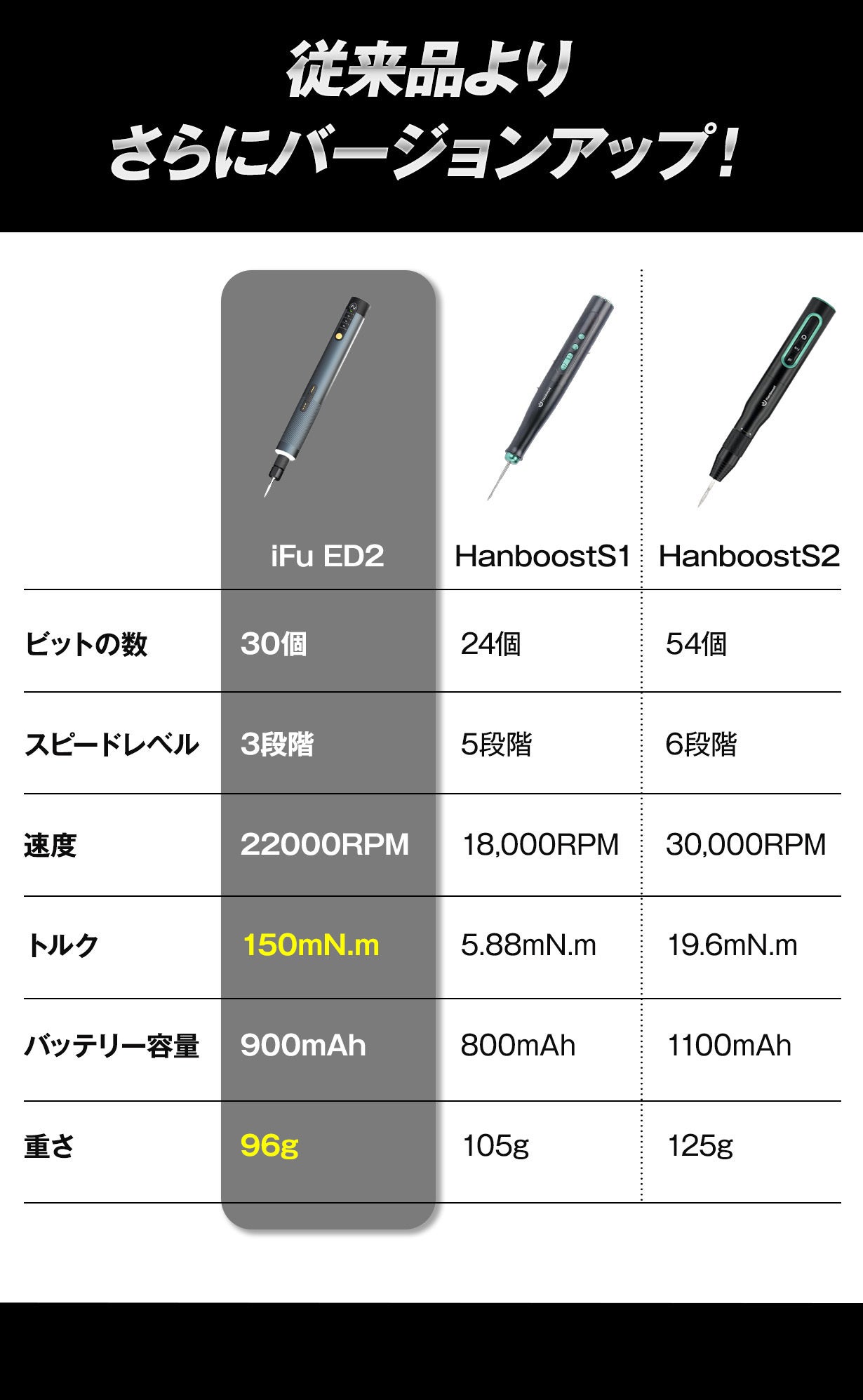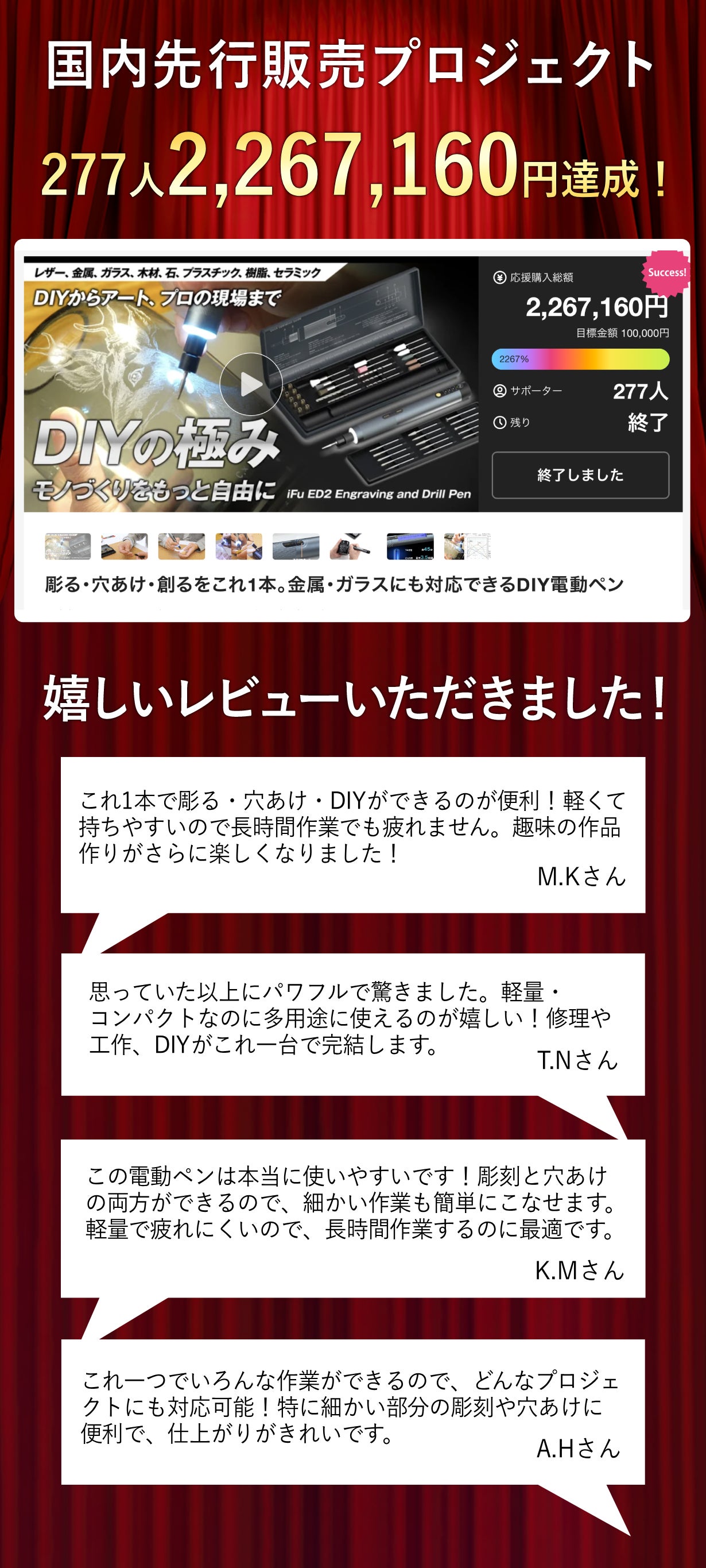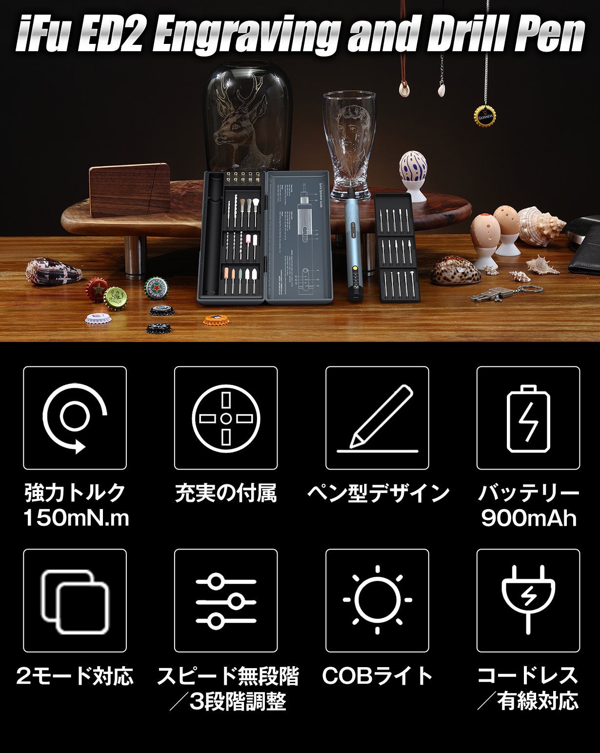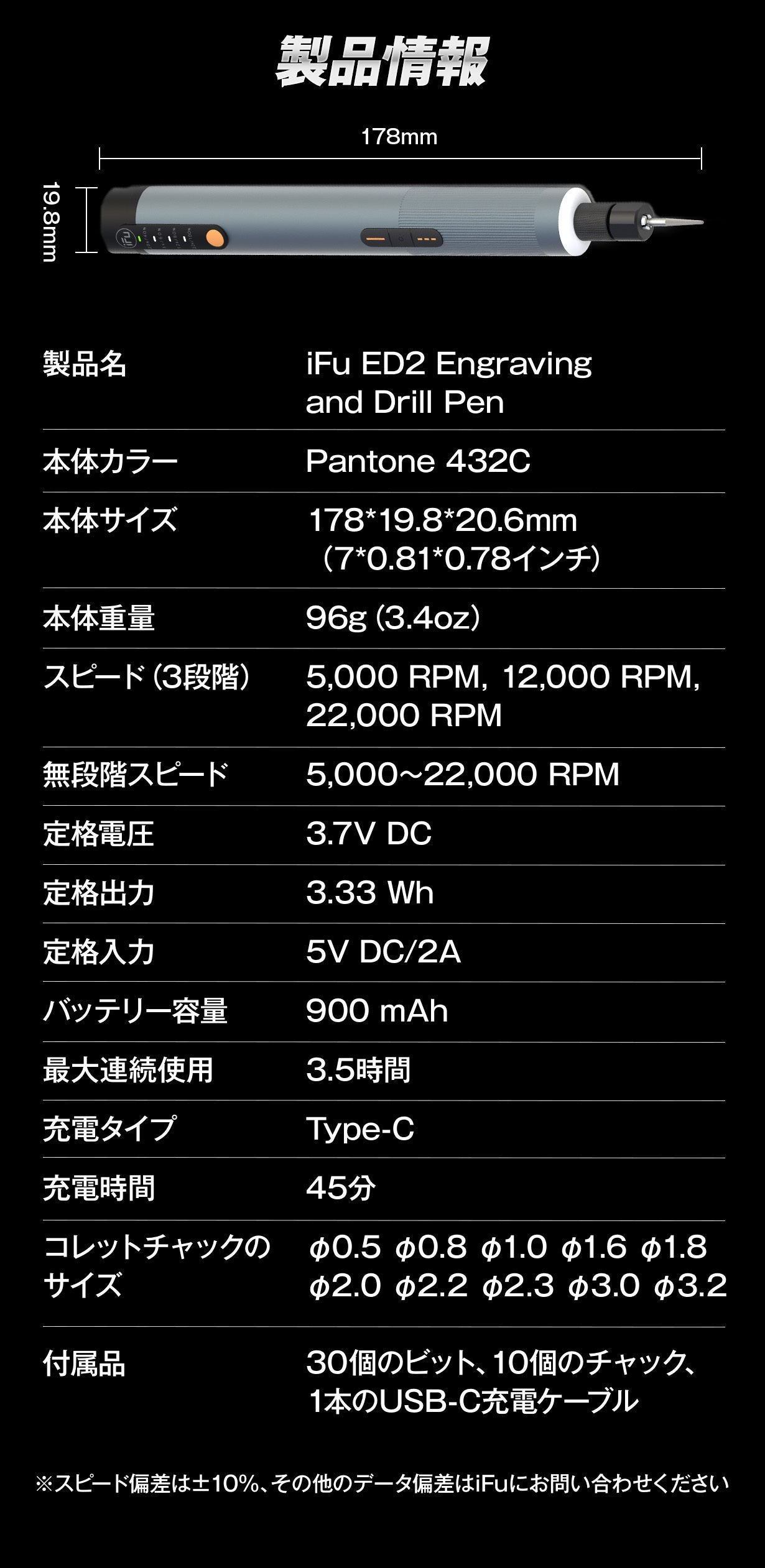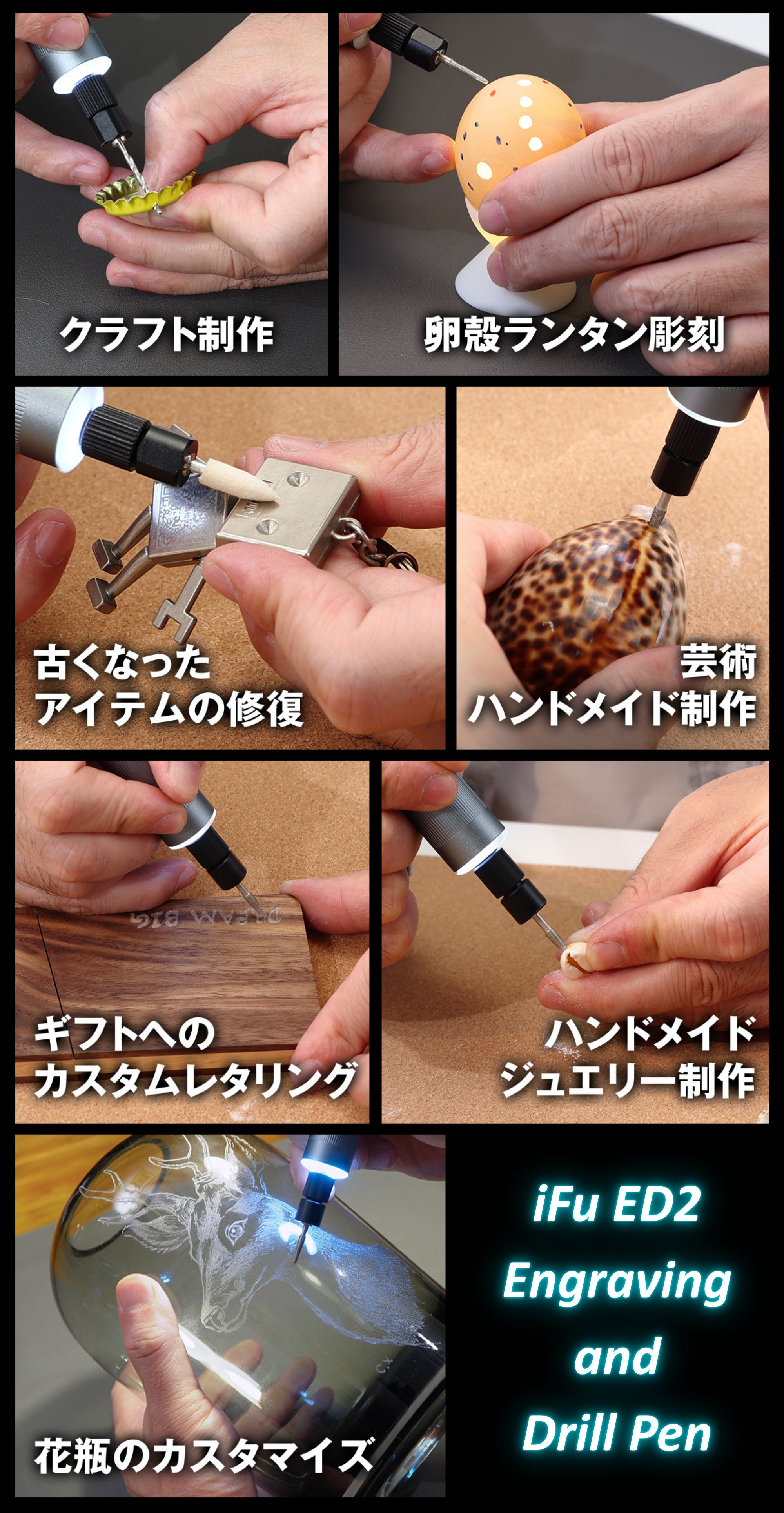 DIYやハンドメイドで、工具の重さやパワー不足、スピード調整の難しさに悩んでいませんか?「iFu ED2」は、そんな悩みを解決する高性能ツールです。軽量設計で長時間作業も疲れにくく、精密な作業もスムーズ。スピード調整やパワーコントロール、LEDライトで細部まで見やすく、工具不要のビット交換で作業効率もアップ。バッテリー持ちや発熱・振動対策も万全で、アクセサリー整理も簡単です。コンパクトながら多機能で高性能。その思いから本プロジェクトを起案しました。