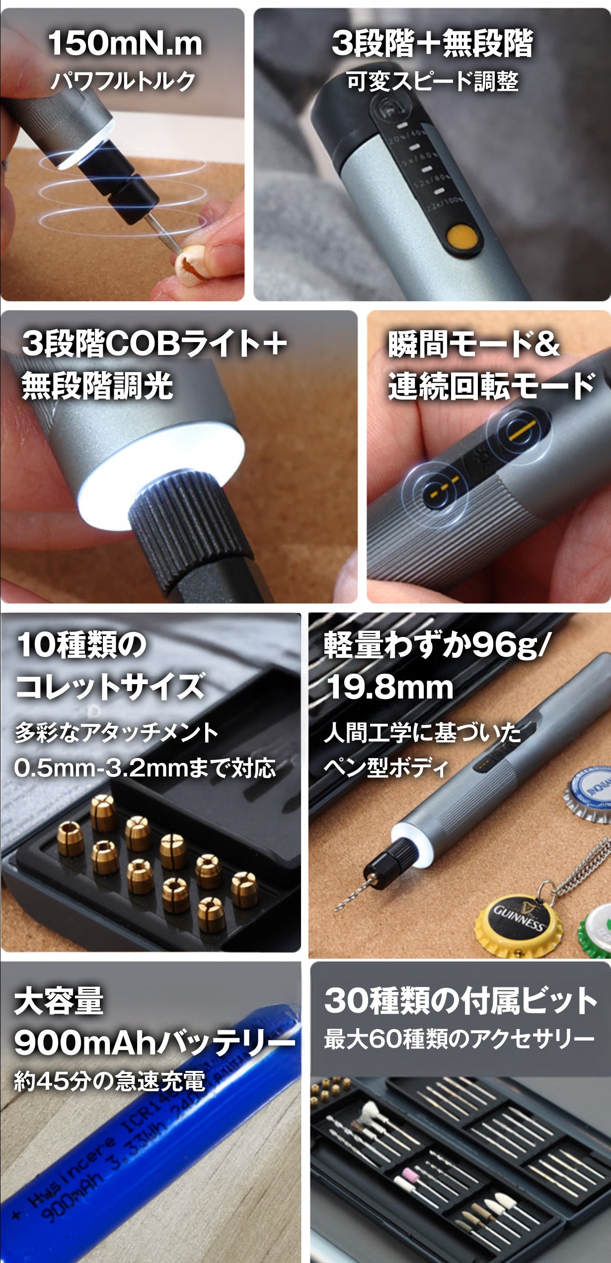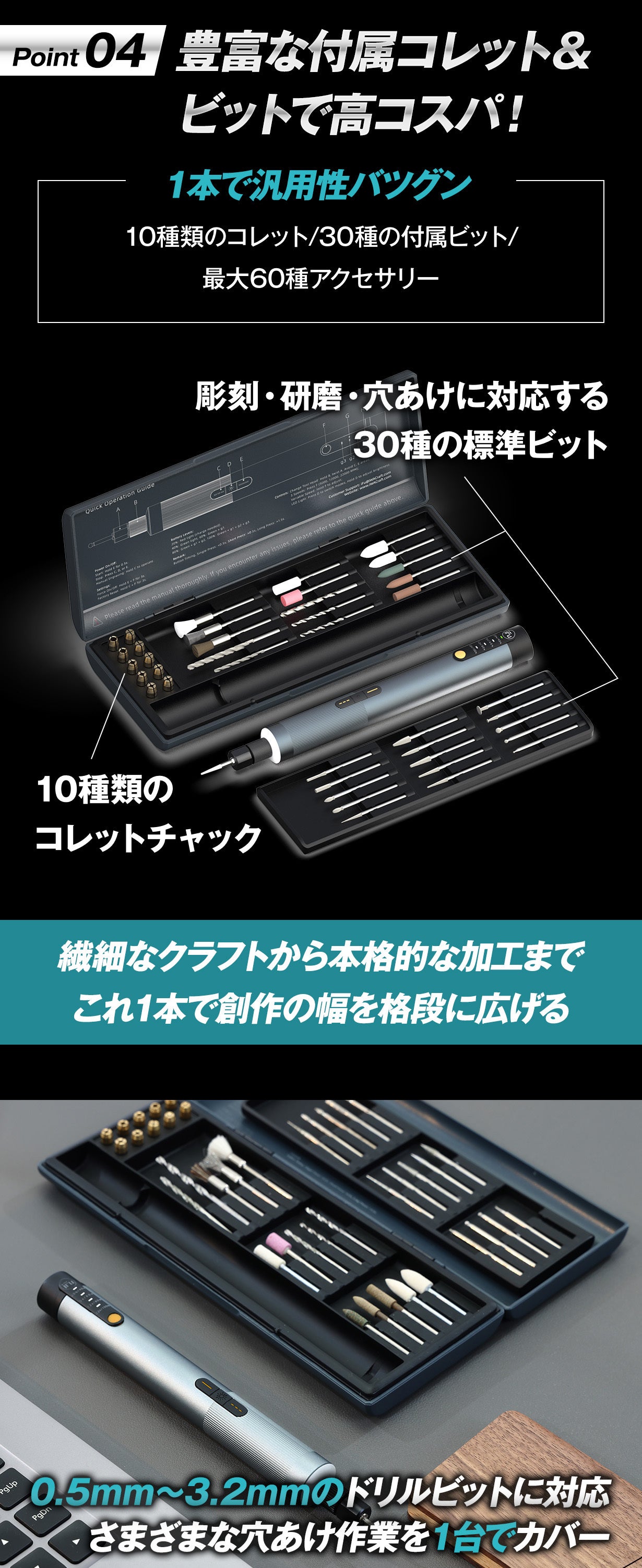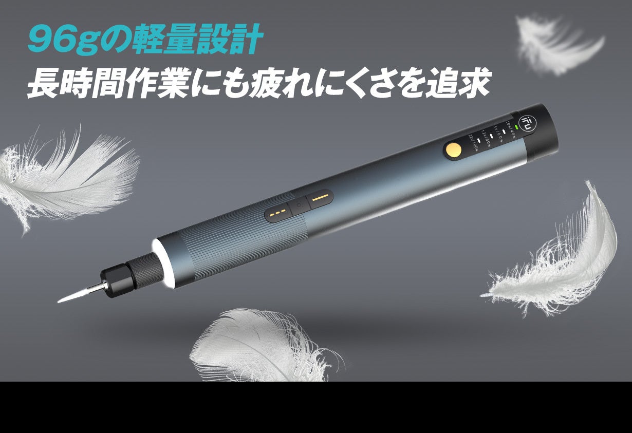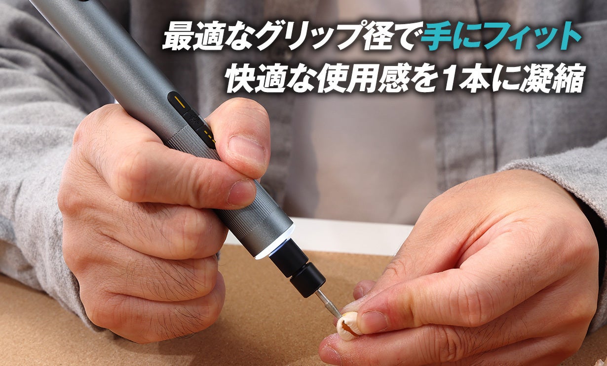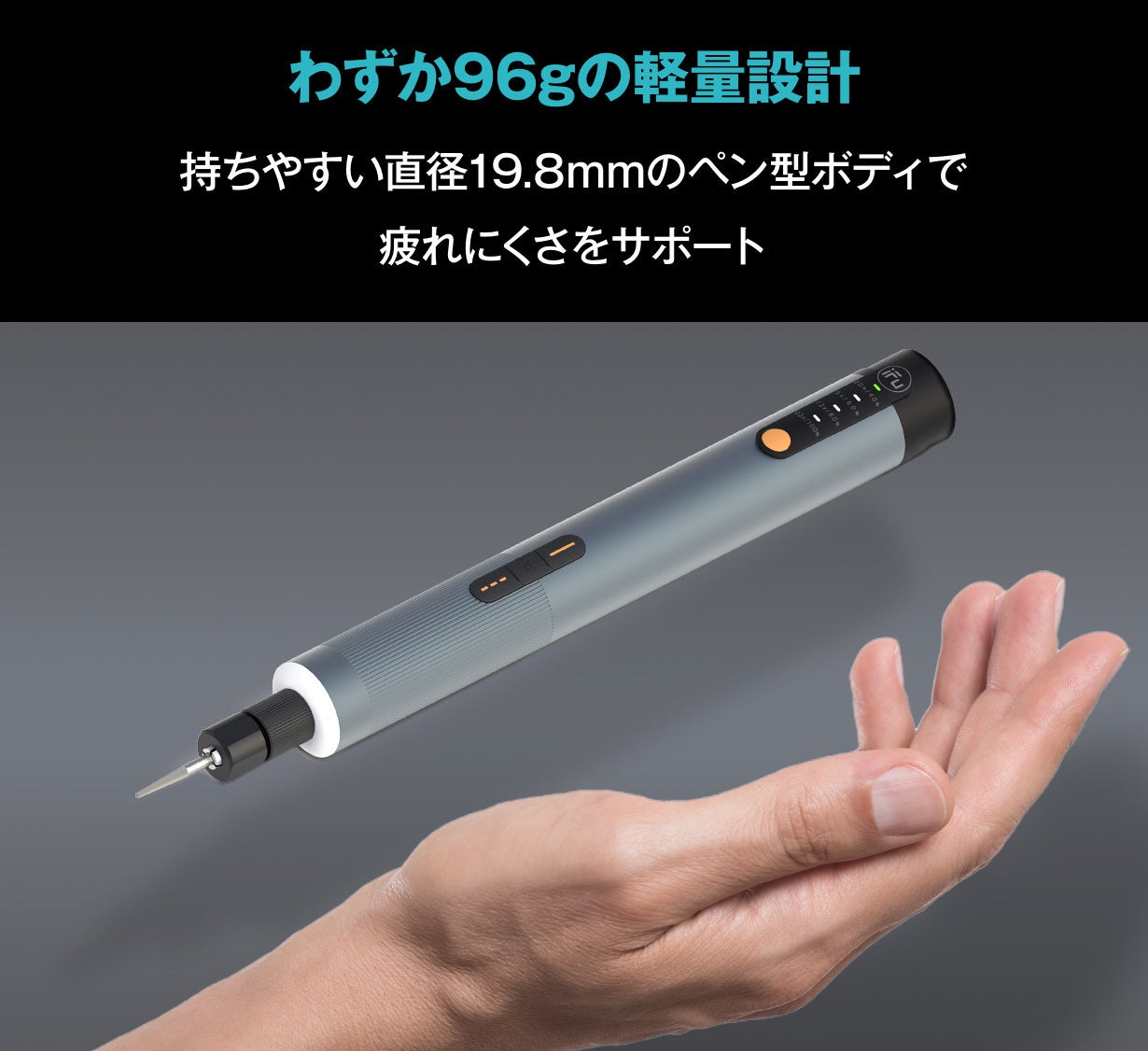 高精度な彫刻と穴あけに対応した、わずか96gの手のひらサイズ電動ペン。操作はシンプルで初心者にも使いやすく、海外クラウドファンディングで1,000万円以上を達成し、多くの実績を誇ります。木材や金属、プラスチックに自由に加工でき、DIYから趣味制作まで幅広く活躍します。
