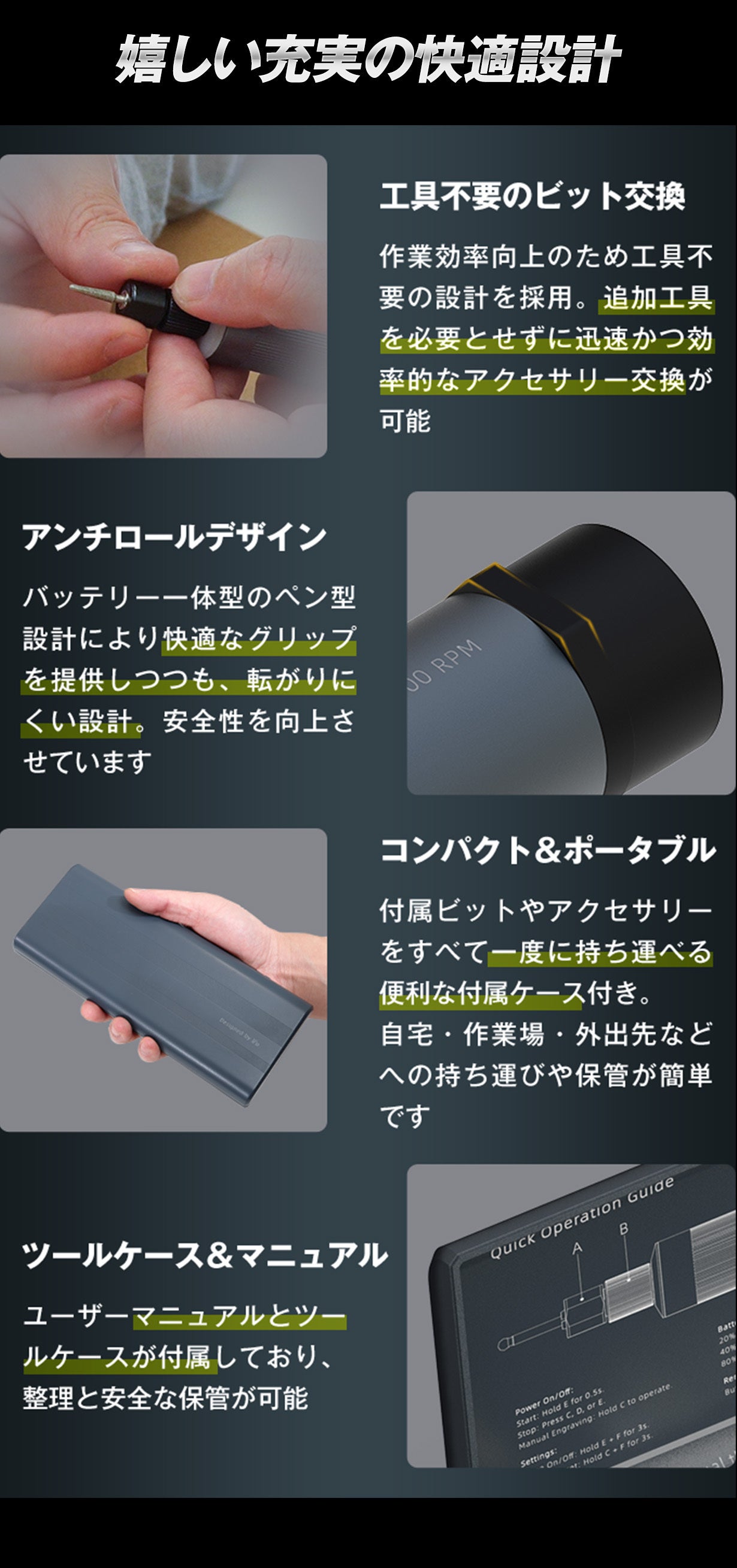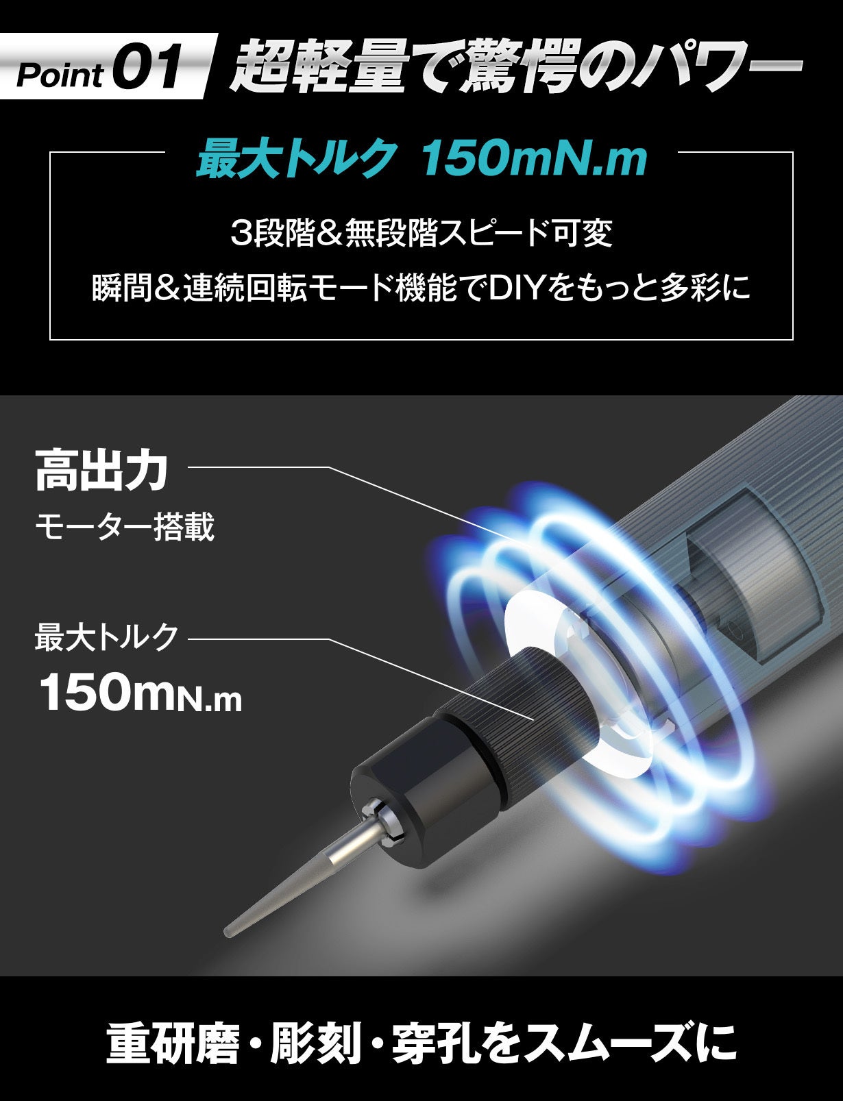 A:本商品は、従来品と比べて、彫刻ができること・トルク数が優れており、日常の様々なシーンで快適にお使いいただけます。細部までこだわった設計が特長です。