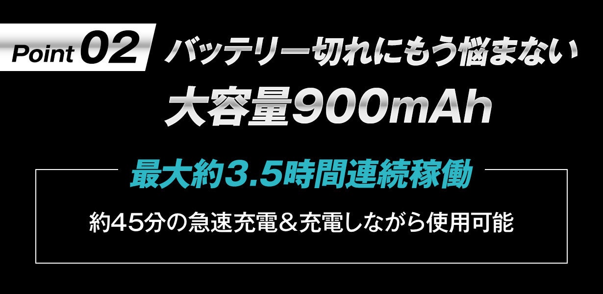 900mAhの高容量バッテリーと、充電しながら使える設計で、時間を気にせず作業に没頭できます。スマート充電保護機能でバッテリーの長寿命化も実現