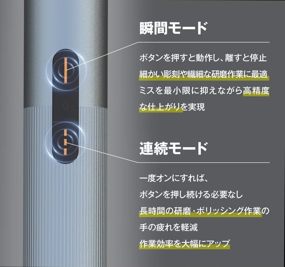 動作は連続モードと押したときだけ動く瞬間モードを選択可能。回転スピードも低速・中速・高速から選べるため、スキルや素材に合わせて使えるのもいいですね。〉