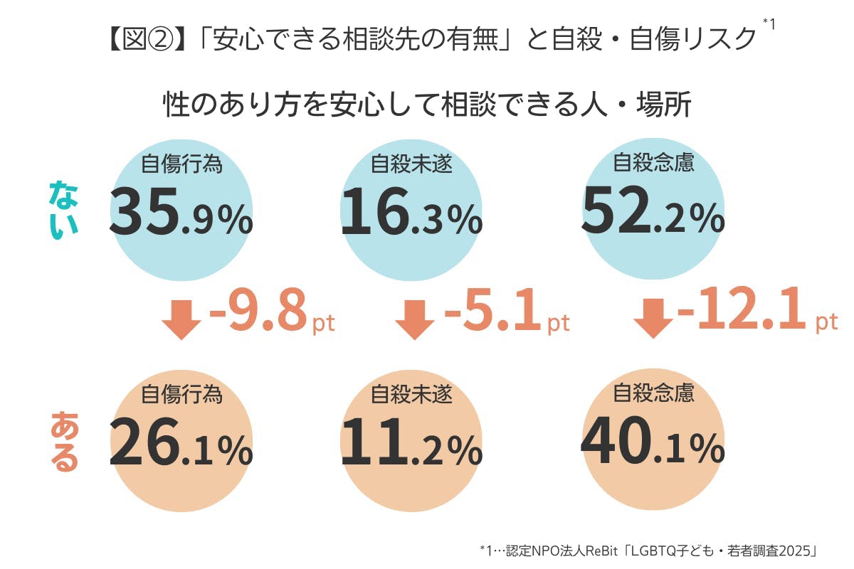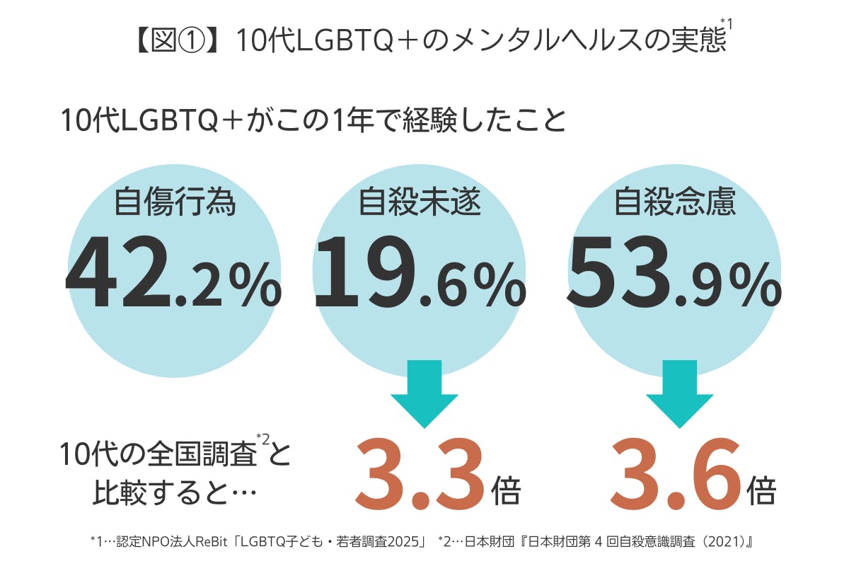LGBTQ+の子ども・ユース(若者)の中には、学校や家庭で安心して自分のことを話せず、孤立の中で悩んでいる人が少なくありません。実際に、10代LGBTQの半数以上が過去1年で自殺を考えた経験があるという調査結果もあります。それでも、「安心して相談できる場所がある」と、そのリスクは大きく下がることがわかっています。