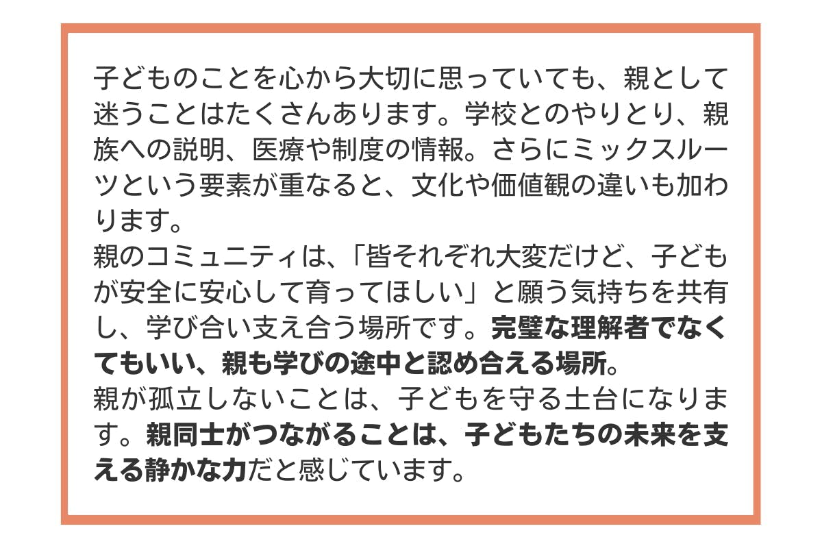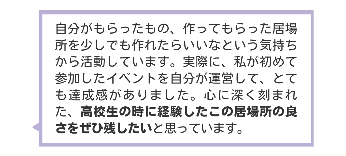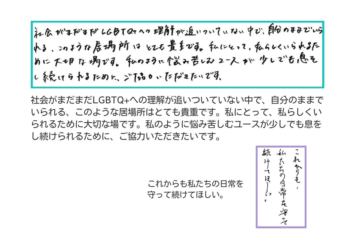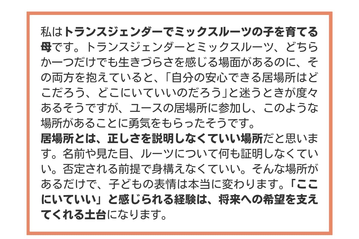 親の会に参加されている方からはLGBTQ+ユースの居場所の意義について、次のようなメッセージをいただきました。