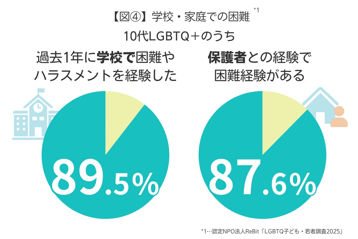 加えて、この調査によると学校や家庭でも困難を経験したことのある人が大半を占めています。