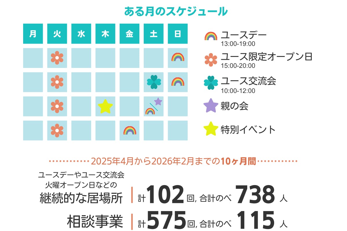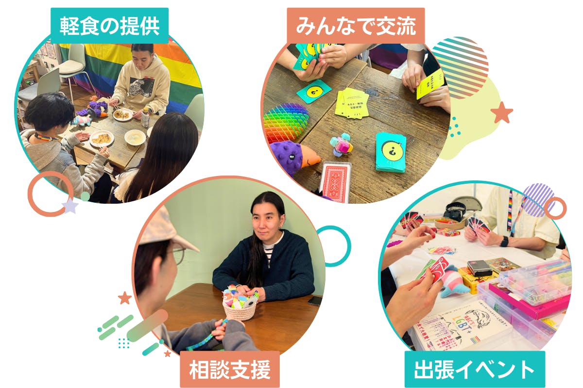 また、この居場所に直接来ることが難しい多くの子ども・ユースのために、オンラインイベント、SNSでの情報提供や、全国各地のLGBTQ+の大型イベントに出張し、そのエリアの子ども・ユースの居場所作りにも積極的に取り組んできました。