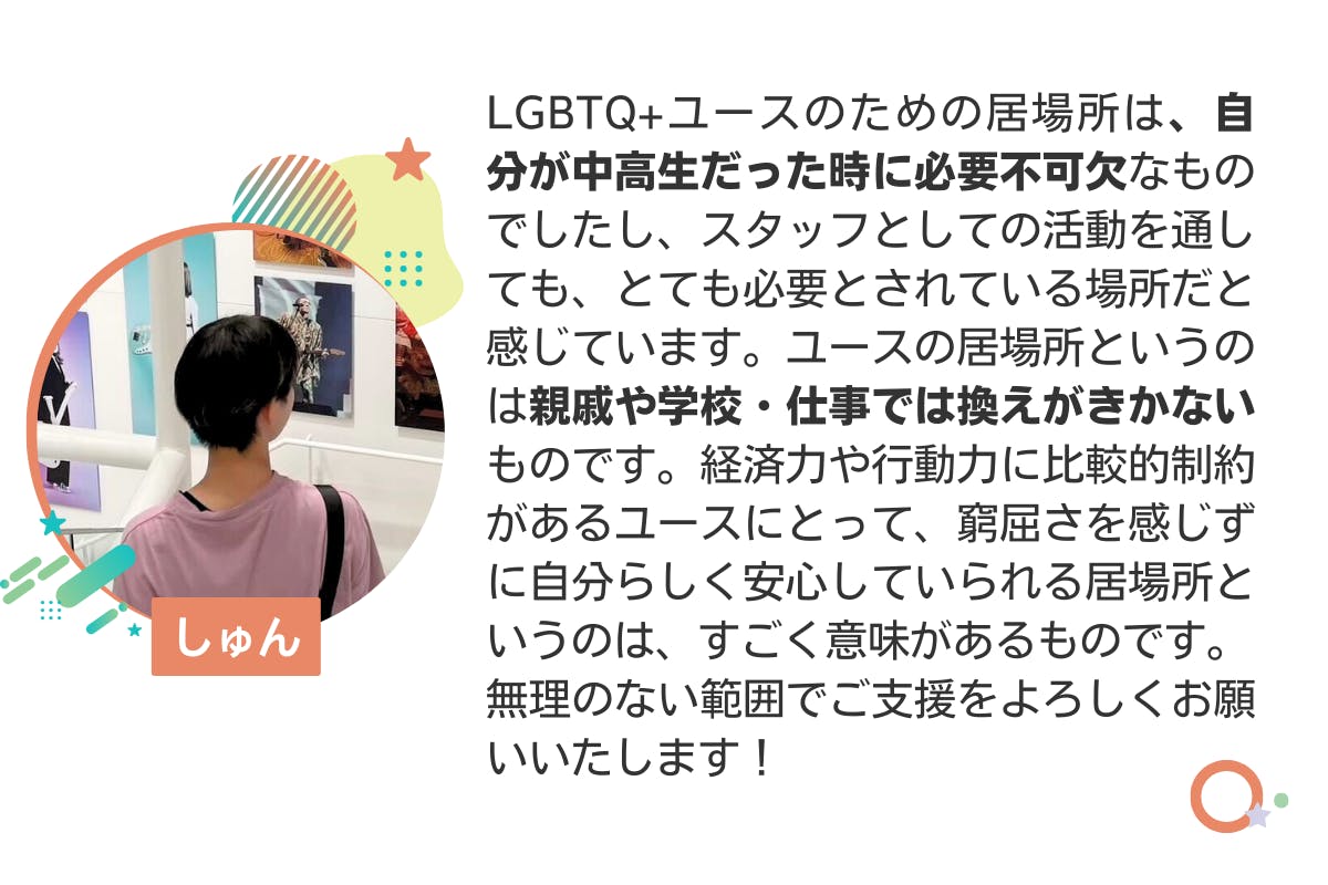 24歳以下のLGBTQ+や「そうかもしれない」と感じる、さまざまなバックグラウンドをもつ子ども・ユースが「ひとりじゃない」と感じられる場所をこれからも続けるために、私たちはこのクラウドファンディングに挑戦します。