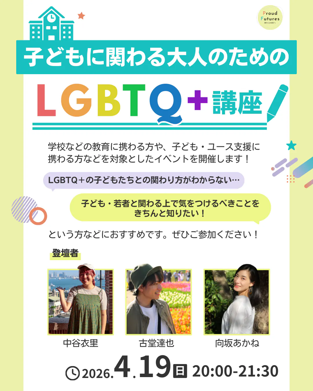 教育者・研究者 熊本理抄さんから応援メッセージをいただきました!・・・・・・・・・・・・・・・・・あのころの私に、こんな場所があってほしかった。10代のころ、「ここにいていい」「ひとりじゃない」と思える場所があったなら、と何度も思います。 だからこそ、Proud Futuresの活動がこれからも続いてほしいと願っています。いま居場所や相談支援を必要としている子どもやユースのそばに、この場所があり続けますように。そんな思いを込めて、心から応援しています。・・・・・・・・・・・・・・・・・現在クラウドファンディング【LGBTQ+の子どもたちに 「ひとりじゃない」を届けつづけたい!】に挑戦中です。クラウドファンディング折り返し地点の4/7(火)までに目標金額の50%を達成することを目指しています!居場所を無くさないためにも、LGBTQ+のアライを増やすためにも、居場所の運営をしてきたユースユニット一同頑張っていきます。もしよろしければご支援やプロジェクトの応援、シェアなどをしていただけますと嬉しいです。▶︎詳細・ご支援はこちらhttps://camp-fire.jp/projects/932526/preview (2026年4月30日締め切り)