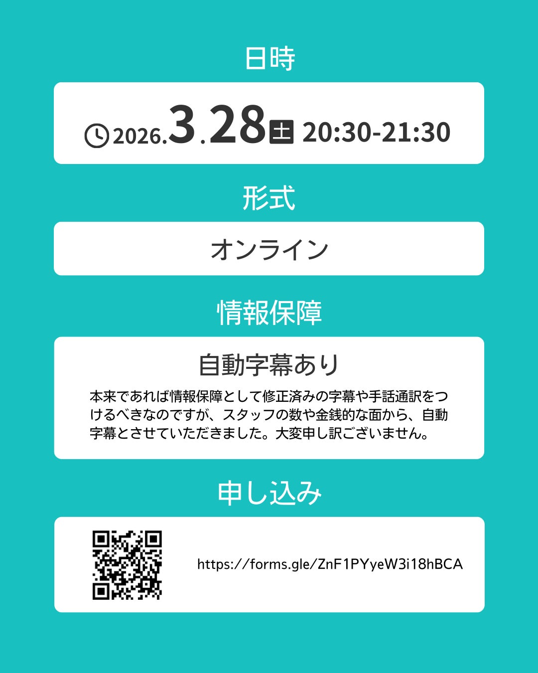 *本来であれば情報保障として修正済みの字幕や手話通訳をつけるべきなのですが、スタッフの数や金銭的な面から、自動字幕とさせていただきました。大変申し訳ございません。