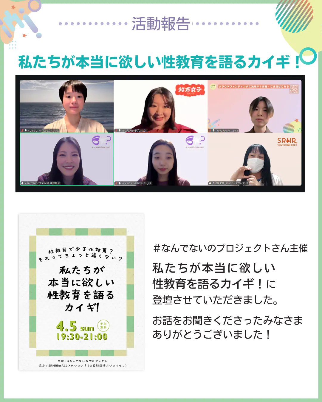 2026/04/06 14:58#なんでないのプロジェクトさん主催の「私たちが本当に欲しい性教育を語るカイギ!」に登壇させていただきました。一緒に私たちが望む性教育とは何かお話しできて、とてもエンパワリングな時間でした!LGBTQ+の子ども・ユースも包摂されるような包括的性教育が広まっていくよう、これからもみなさんと一緒に頑張っていけたら嬉しいです。イベントを主催してくださった#なんでないのプロジェクトさん、一緒に登壇した地方女子プロジェクトさん、SRHRユースアライアンスさん、そしてご参加くださった参加者のみなさま、本当にありがとうございました!今後もLGBTQ+の子ども・ユースの現状を知ってもらう、アライを増やすためにもオンラインのイベントを実施する予定です。どれも参加無料で、当日参加が難しい場合でもアーカイブ配信がありますので、ぜひお気軽にご参加ください!【LGBTQ+ユースが語り合う“居場所”ってなに?】居場所を運営してきた ユースユニットのメンバーたちが登壇し、 自分の性のあり方やカミングアウトについてなど、 LGBTQ+ユースのリアルについて話しつつ、 「居場所」について考えます。 ▶︎2026年4月10日(金) 20:00-21:00▶︎詳細:https://www.proudfutures.org/post/20260410event【子どもに関わる大人のためのLGBTQ+講座】教育や子ども・ユース支援に携わる方を対象として、LGBTQ+の子ども・ユースについてや、関わる上で知っておくべきことについて、専門性をもったゲストにご講演いただきます。▶︎2026年4月19日(日) 20:00-21:30▶︎詳細:https://www.proudfutures.org/post/20260419event【LGBTQ+ユースの声から考える 働きやすい職場とは―就活・就労のリアルと企業にできること】LGBTQ+ユース3名による就活・就労のリアルな経験の共有と、就労支援に取り組む専門家のレクチャーを通して、LGBTQ+の人にとっての就活や、働きやすい職場のあり方を考えます。▶︎2026年4月24日(金)20:00-21:00▶︎詳細:https://www.proudfutures.org/post/20260328event もっと見る