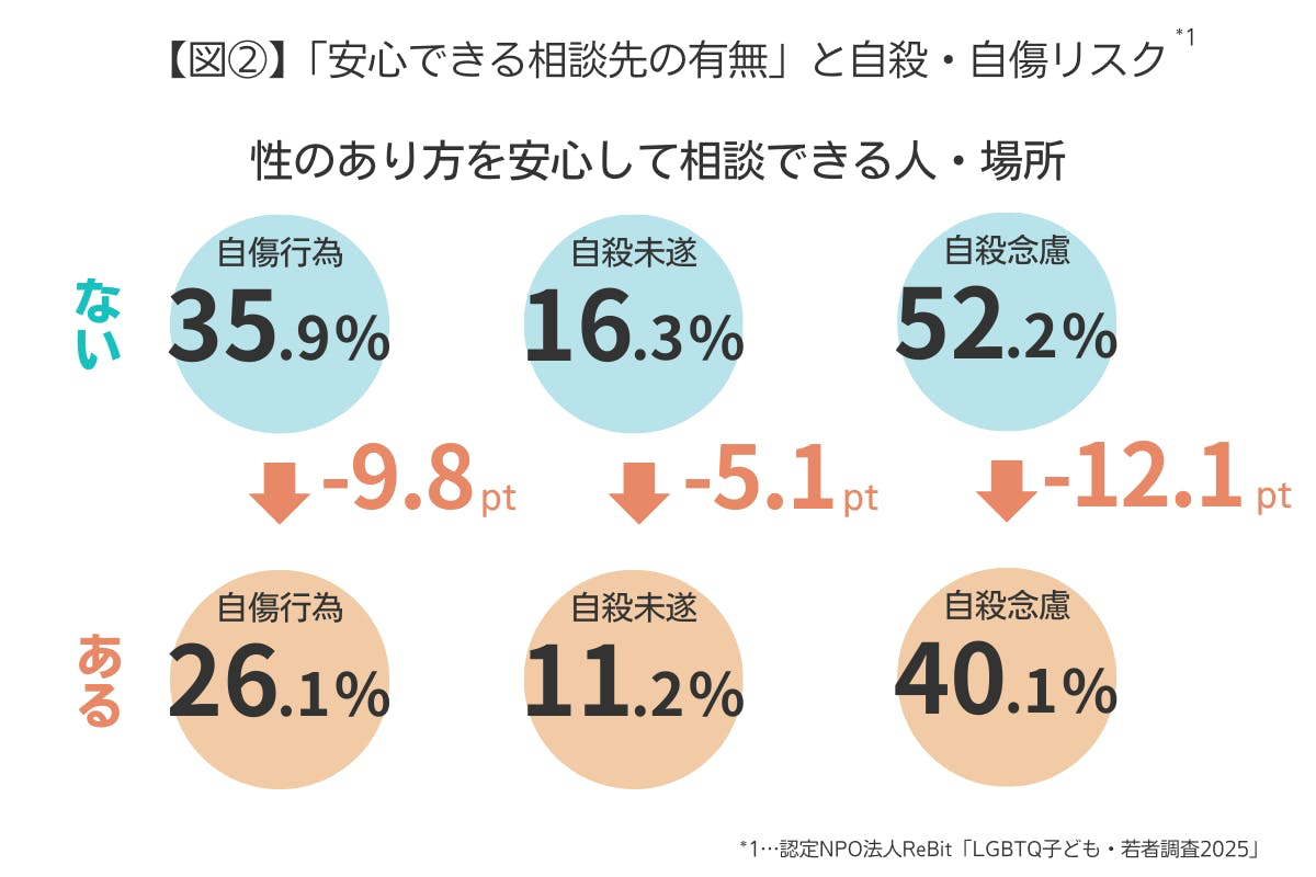 LGBTQ+の子ども・ユース(若者)の中には、学校や家庭で安心して自分のことを話せず、孤立の中で悩んでいる人が少なくありません。実際に、10代LGBTQの半数以上が過去1年で自殺を考えた経験があるという調査結果もあります。それでも、「安心して相談できる場所がある」と、そのリスクは大きく下がることがわかっています。