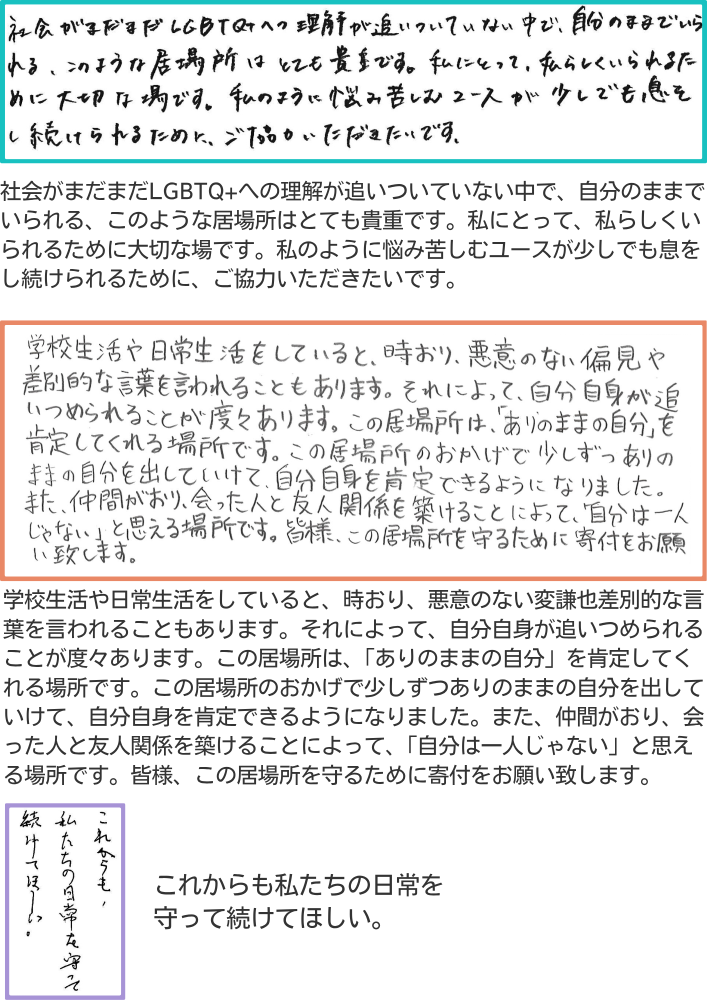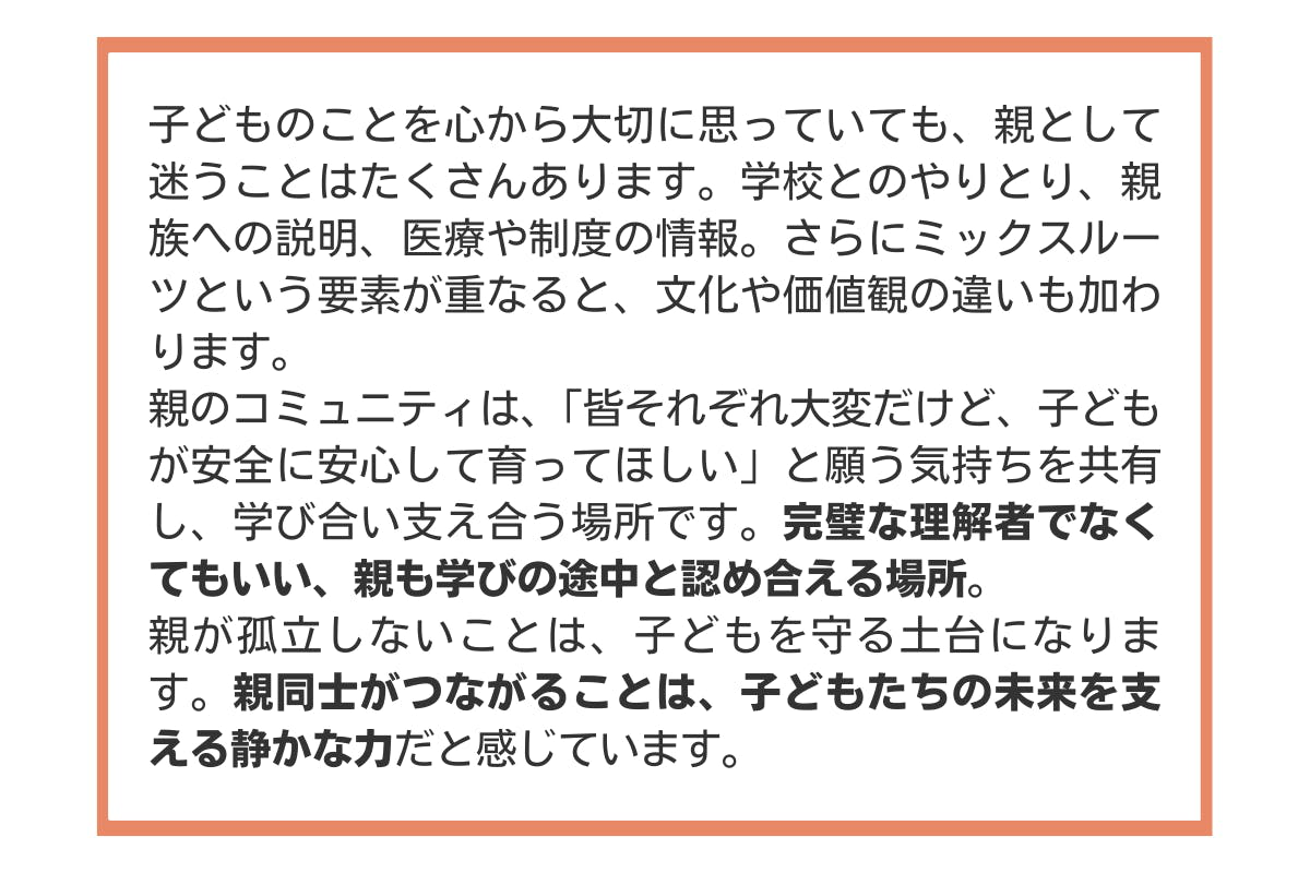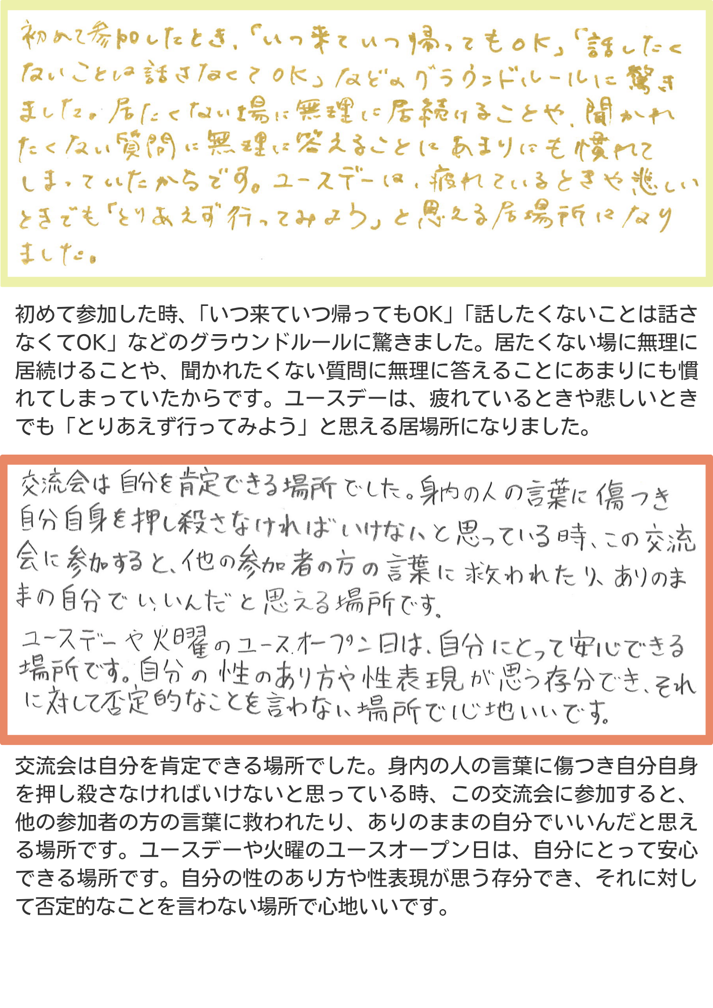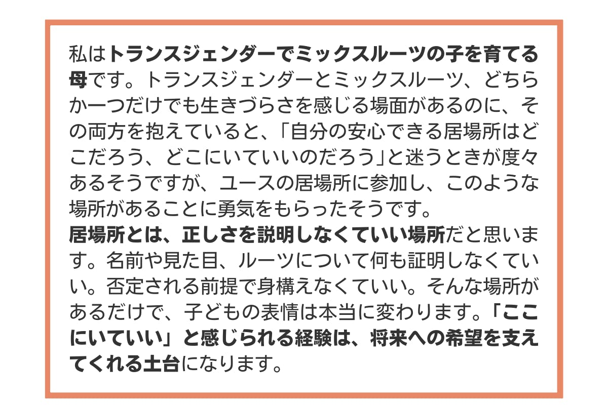 親の会に参加されている方からはLGBTQ+の子ども・ユースの居場所の意義について、次のようなメッセージをいただきました。