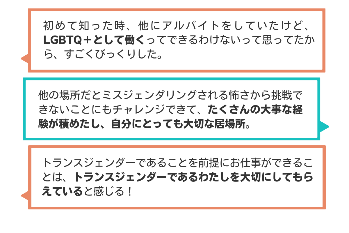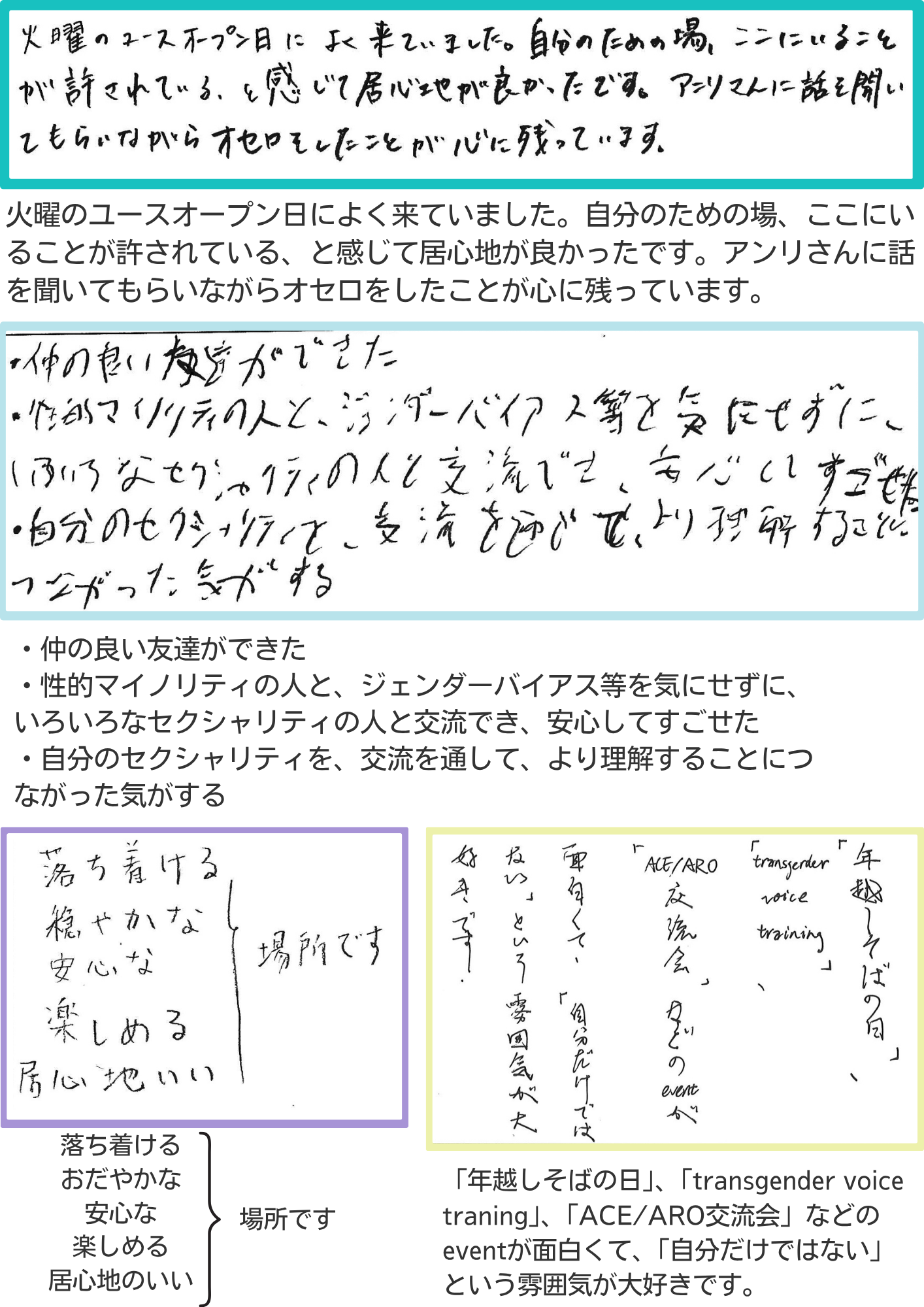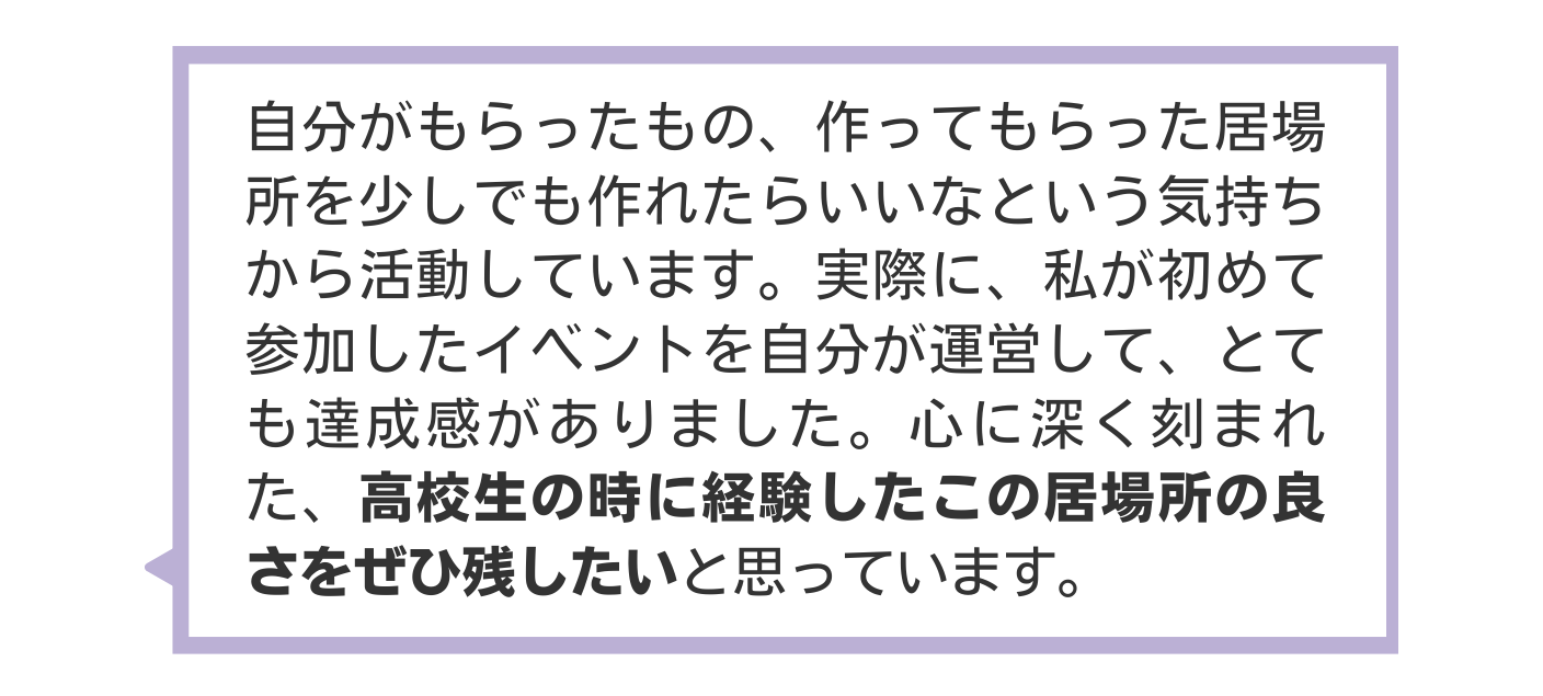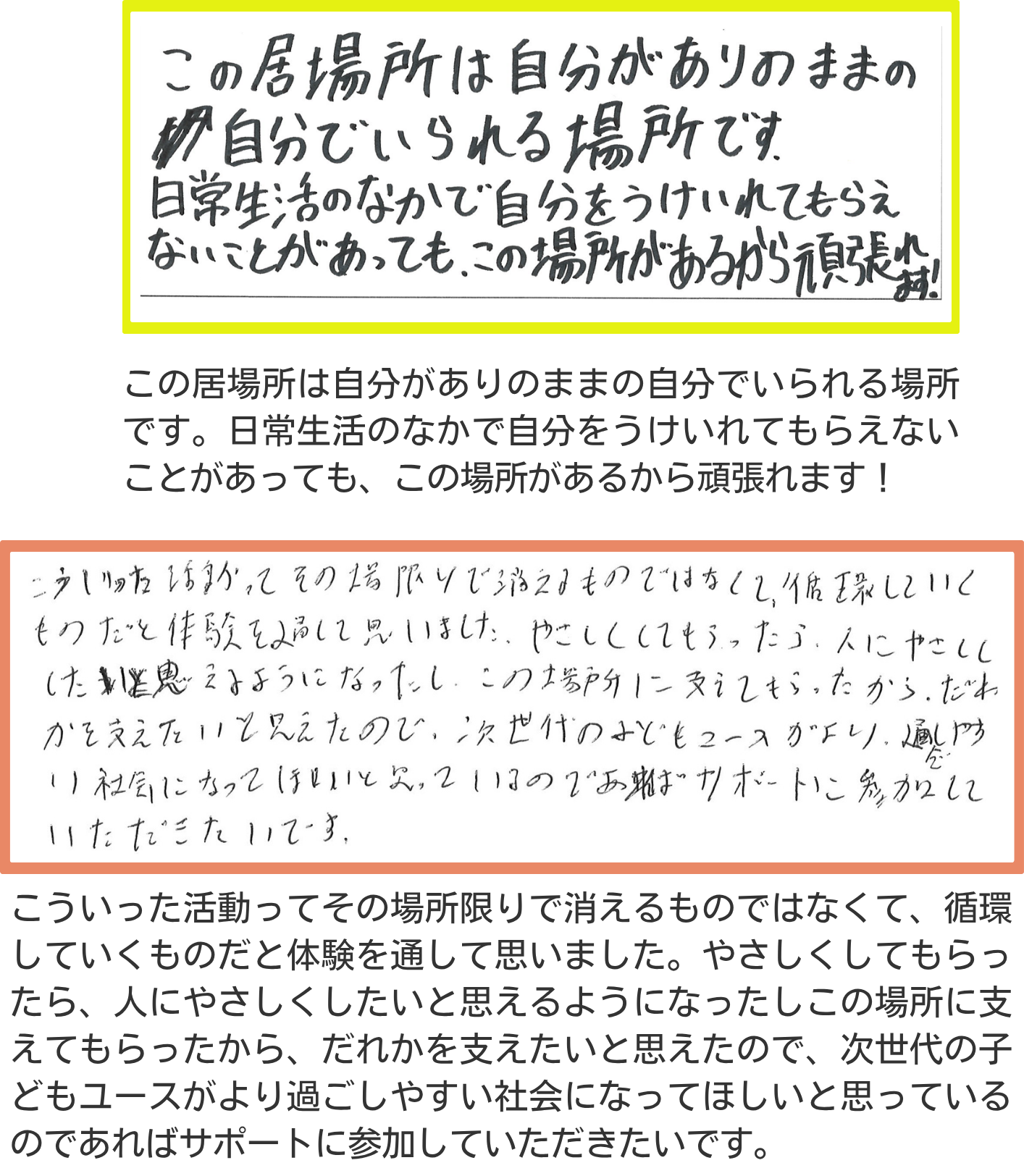 親の会に参加されている方からはLGBTQ+の子ども・ユースの居場所の意義について、次のようなメッセージをいただきました。