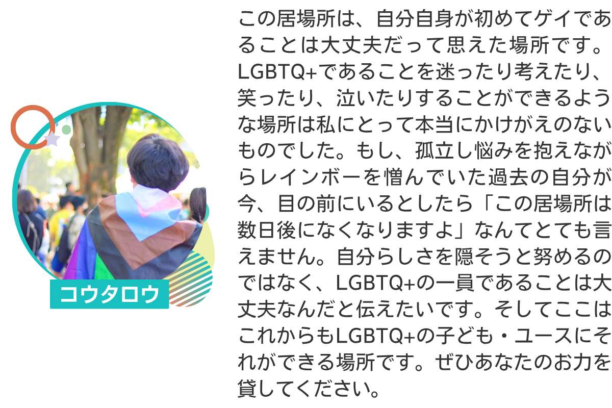 24歳以下のLGBTQ+や「そうかもしれない」と感じる、さまざまなバックグラウンドをもつ子ども・ユースが「ひとりじゃない」と感じられる場所をこれからも続けるために、私たちはこのクラウドファンディングに挑戦します。