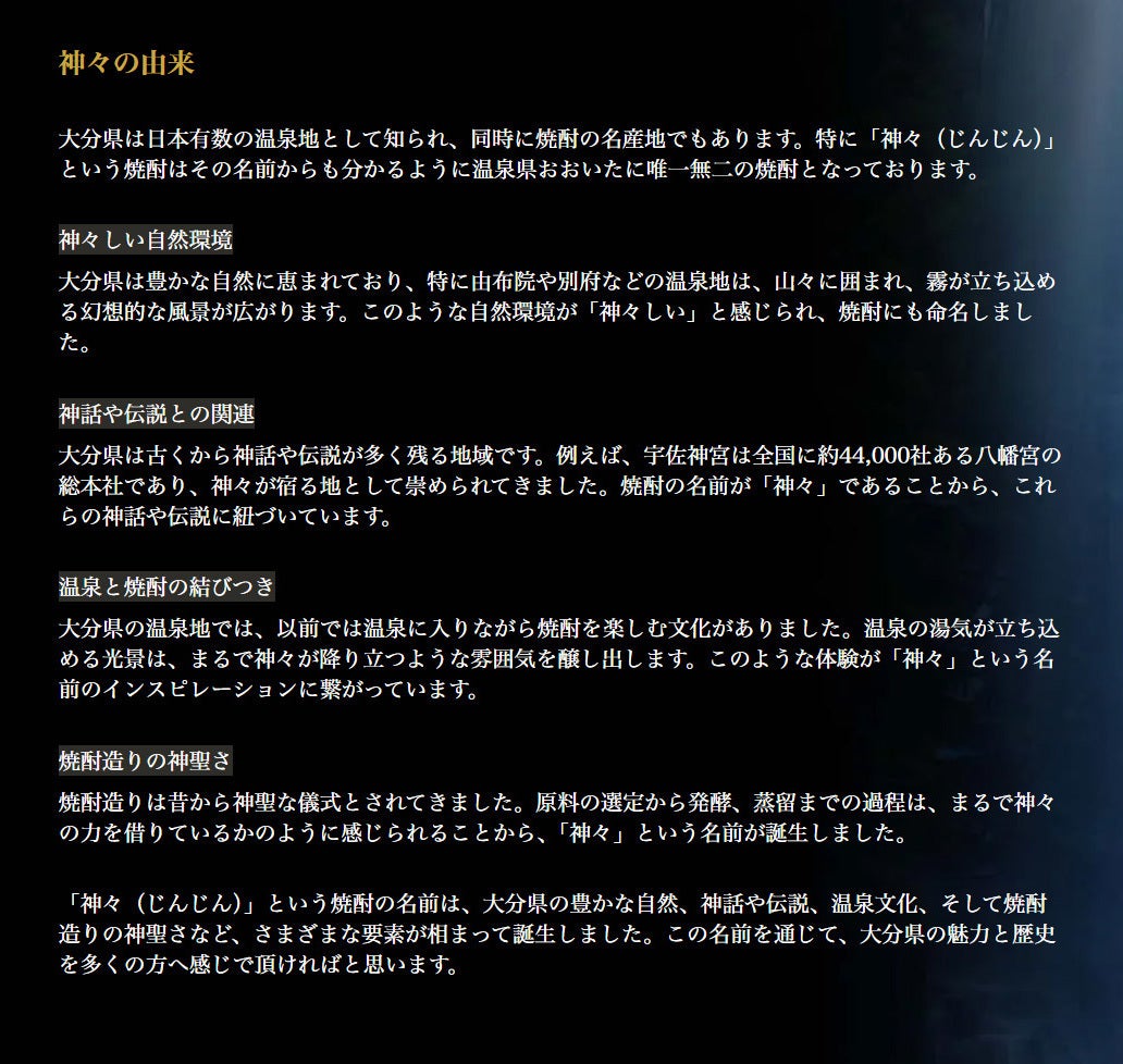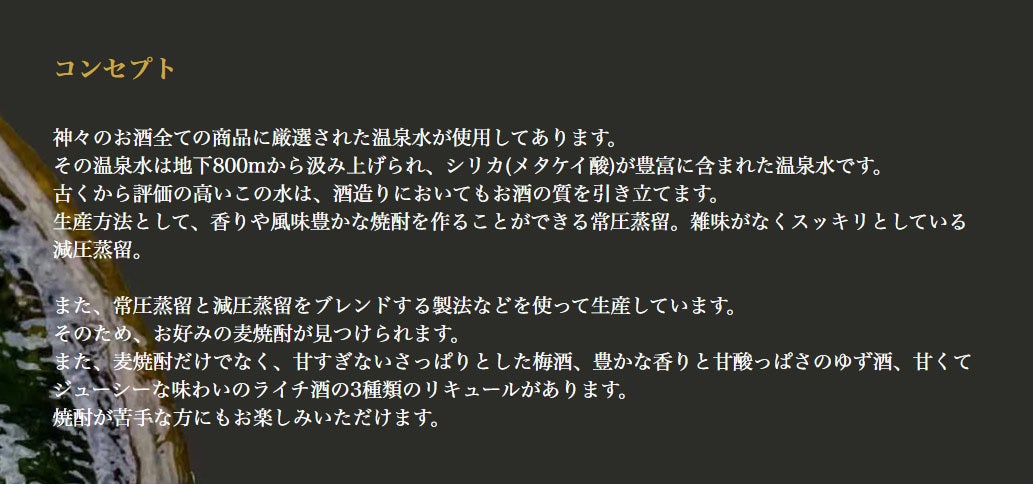 当社は、大分温泉焼酎『神々』の販売元として酒類取扱実績がございます。