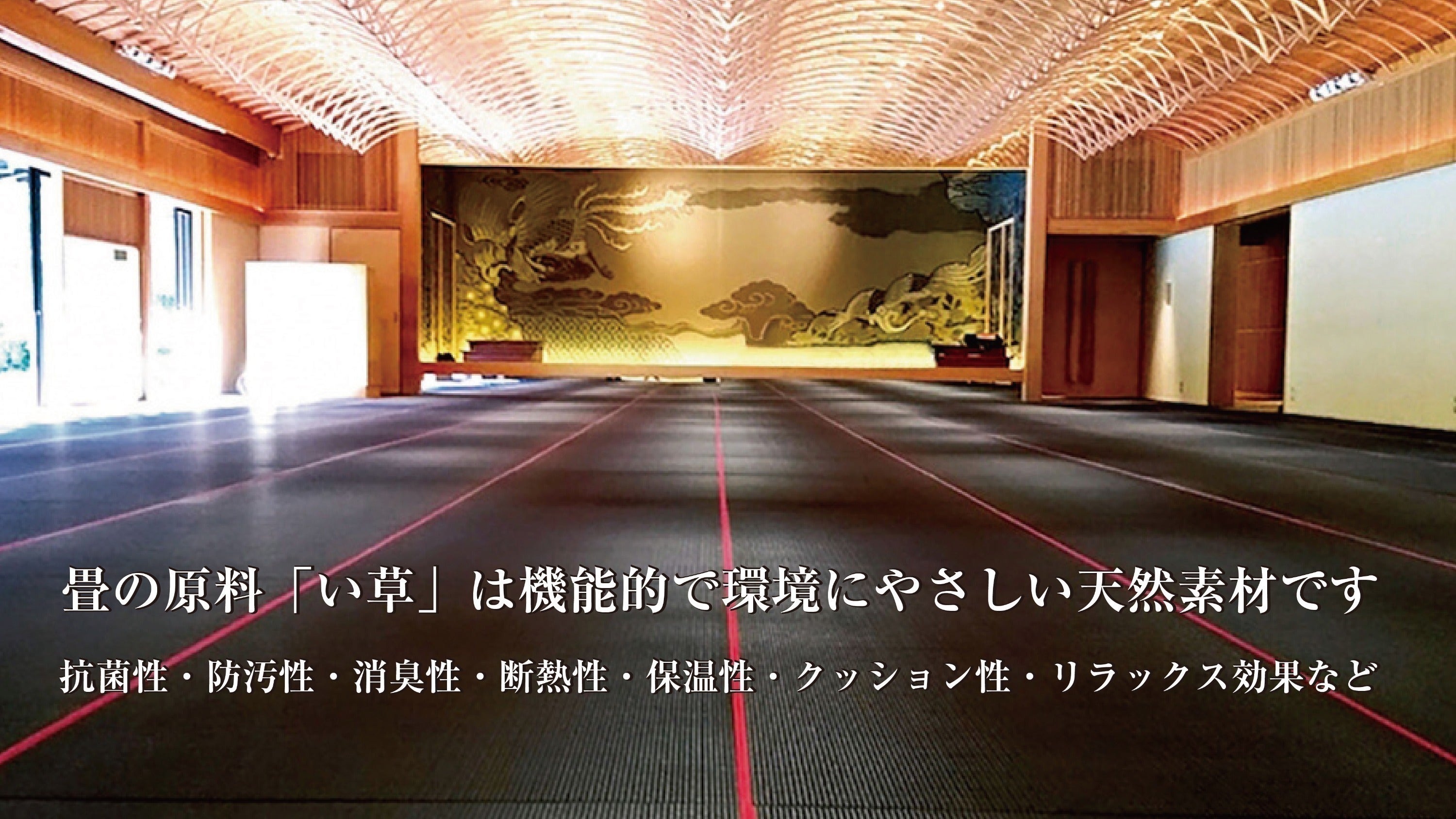 畳素材のい草は、リラックス効果、空気清浄、調湿、抗菌・消臭といった、心身の健康と住環境を整える多様な効能があります。フローリング化が進み、畳のお部屋は少なくなりましたが。その機能性が現在、再注目されています。
