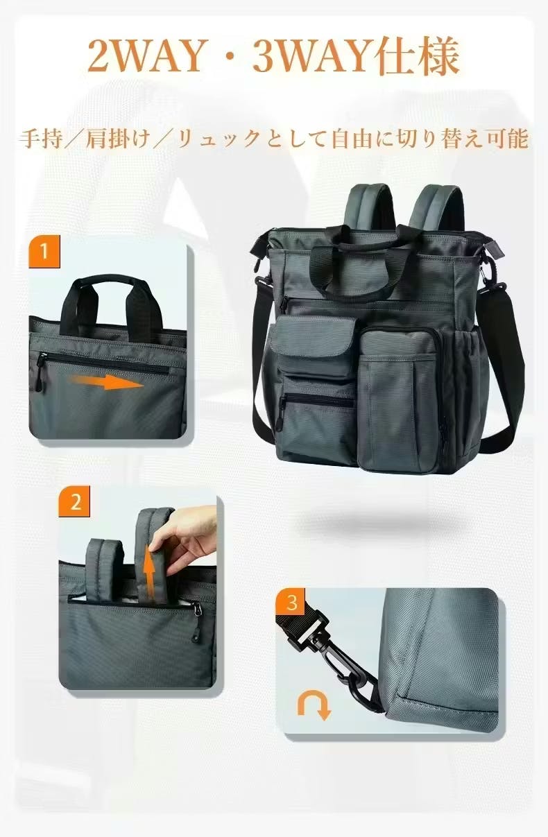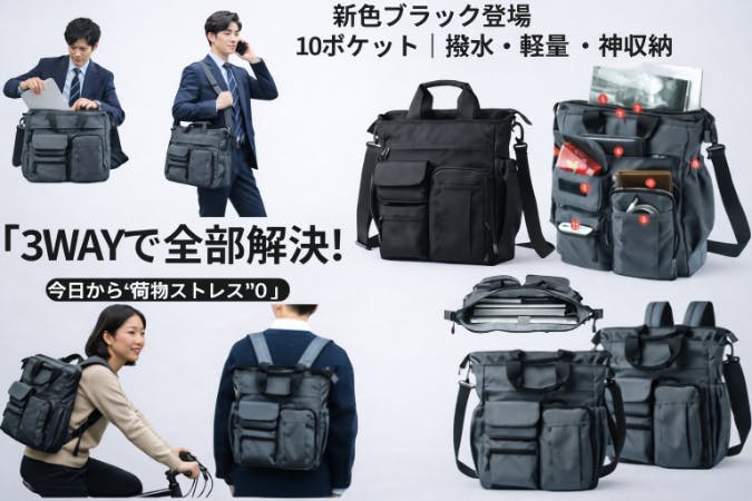 3WAYバッグ,多機能バッグ,通勤バッグ,ビジネスバッグ,リュックバッグ,ショルダーバッグ,手提げバッグ,撥水バッグ,軽量バッグ,収納バッグ,大容量バッグ,整理収納バッグ,ポケット多いバッグ,10ポケットバッグ,ブラックバッグ,男女兼用バッグ,日常使いバッグ,通勤通学バッグ,自転車通勤バッグ,旅行バッグ,アウトドアバッグ,ガジェット収納,仕事バッグ,新生活バッグ,便利バッグ,機能性バッグ,ミニマルバッグ,シンプルデザインバッグ,クラウドファンディング,先行販売