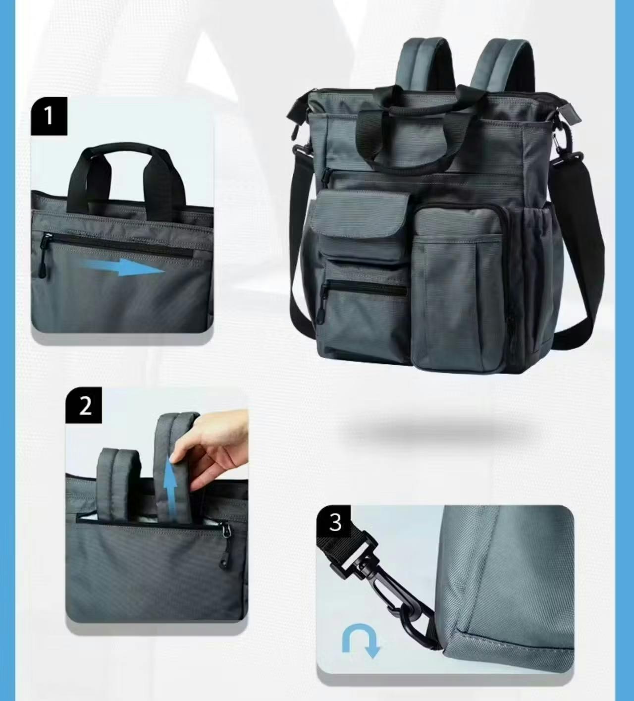 手提げ/肩掛け/リュック の3スタイルを一瞬で切り替え可能。