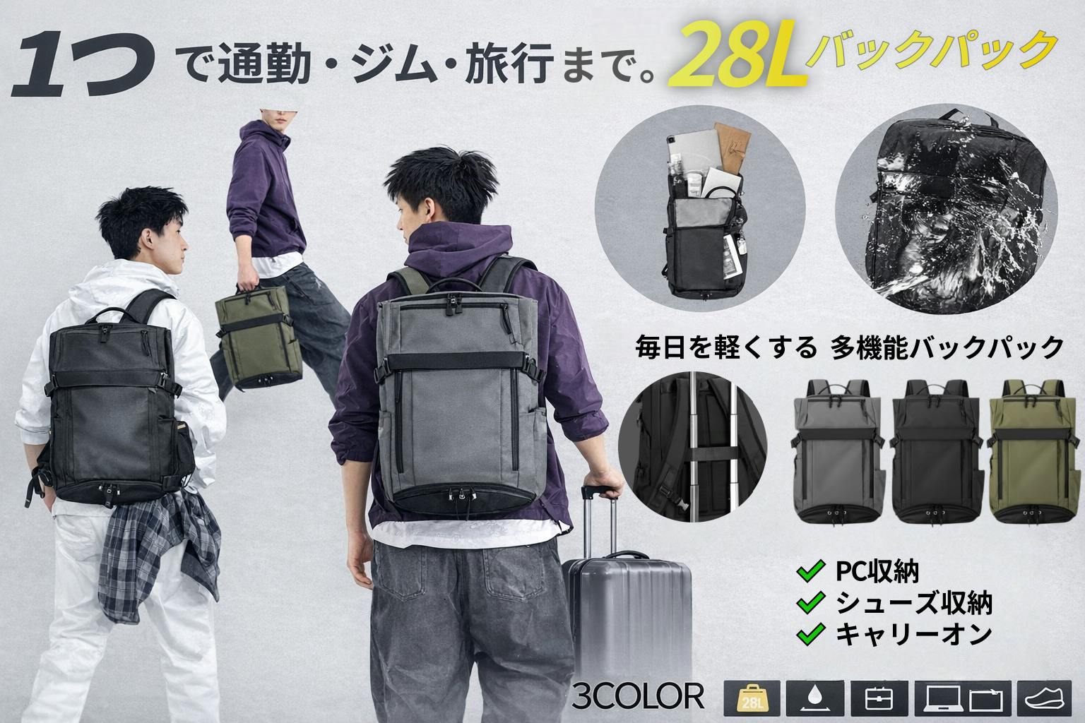③通勤・ジム・旅行、これ1つ。 28L大容量で毎日を軽くする多機能バックパック