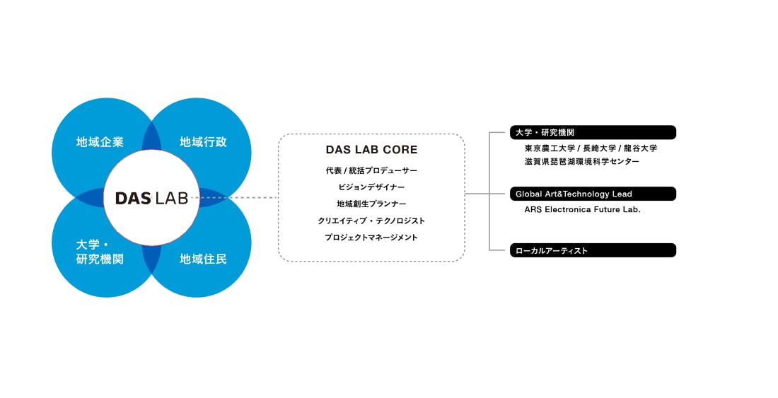 DAS LABは、データ・アート・サイエンスを横断し、その地域ならではの未来を構想、実現する共創組織(コレクティブ)です。2023年より滋賀県をフィールドに、ウォーターセントリック(水を中心に未来を構想する)ビジョンのもと共創活動に取り組んでいます。