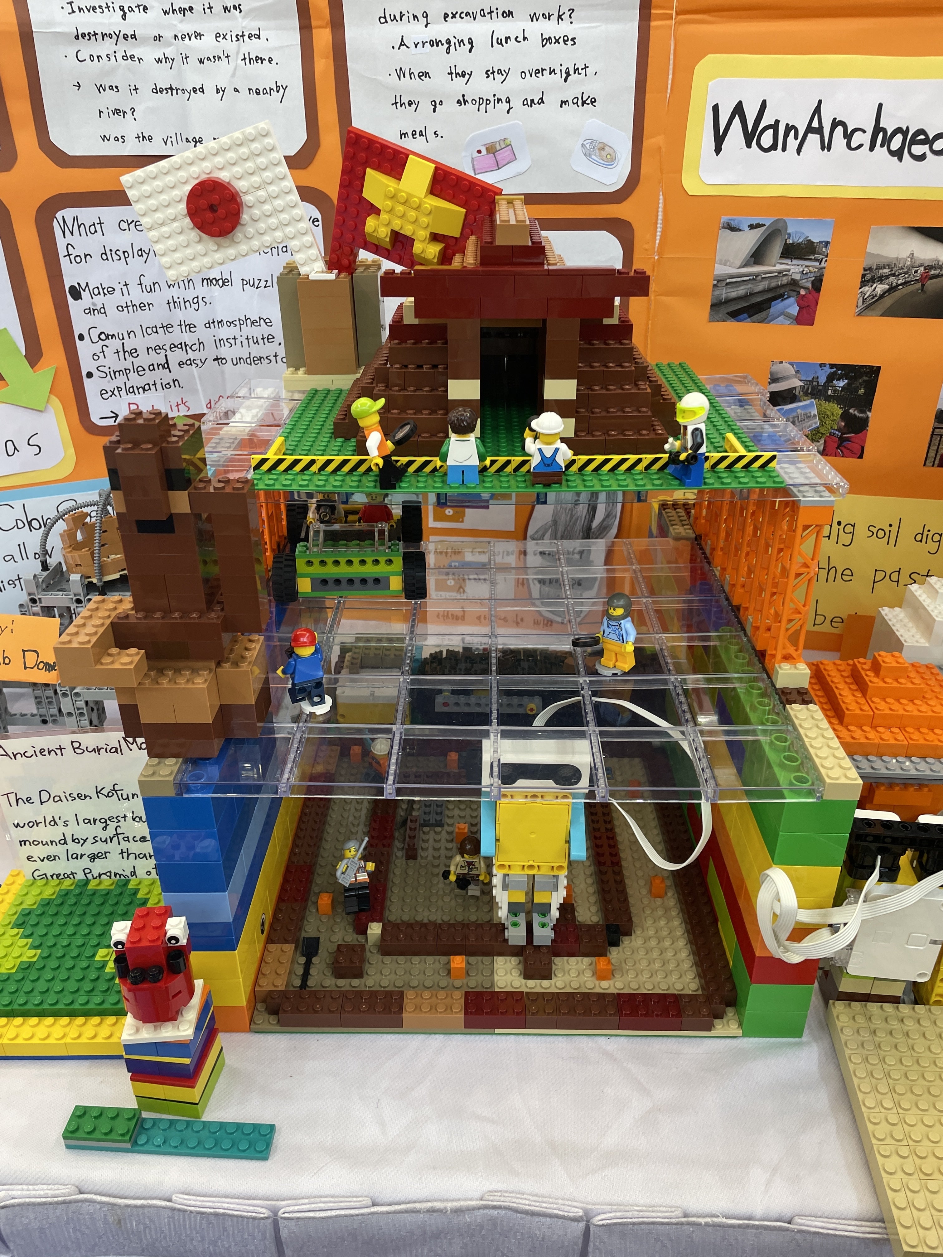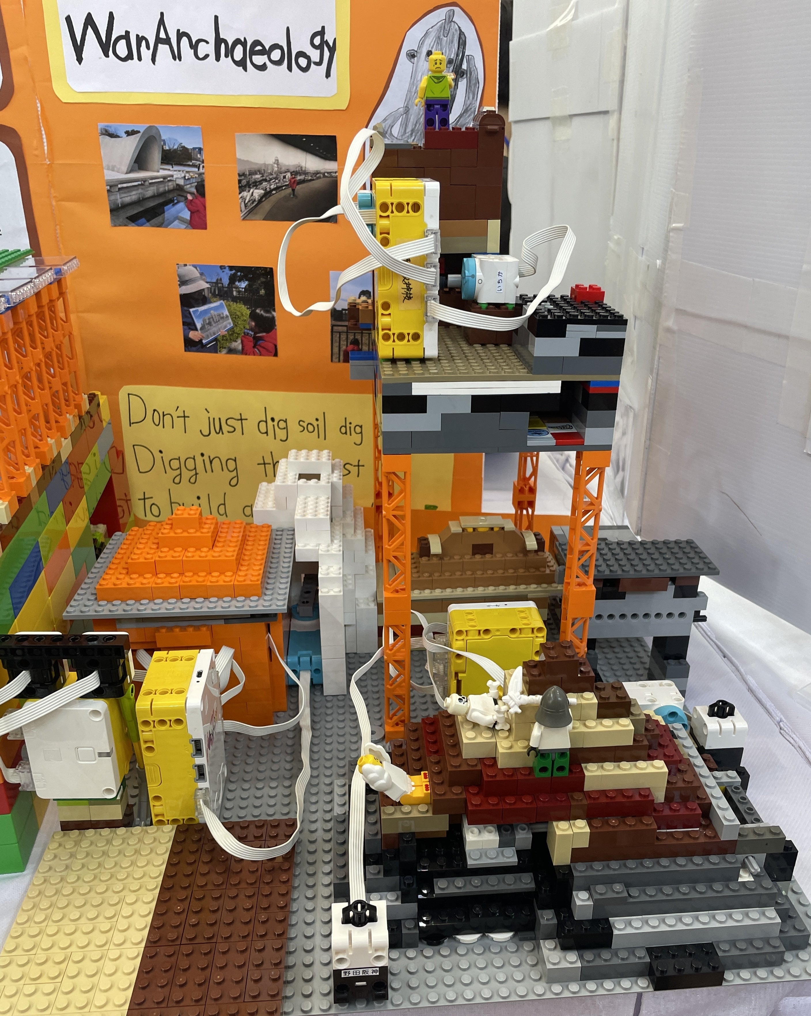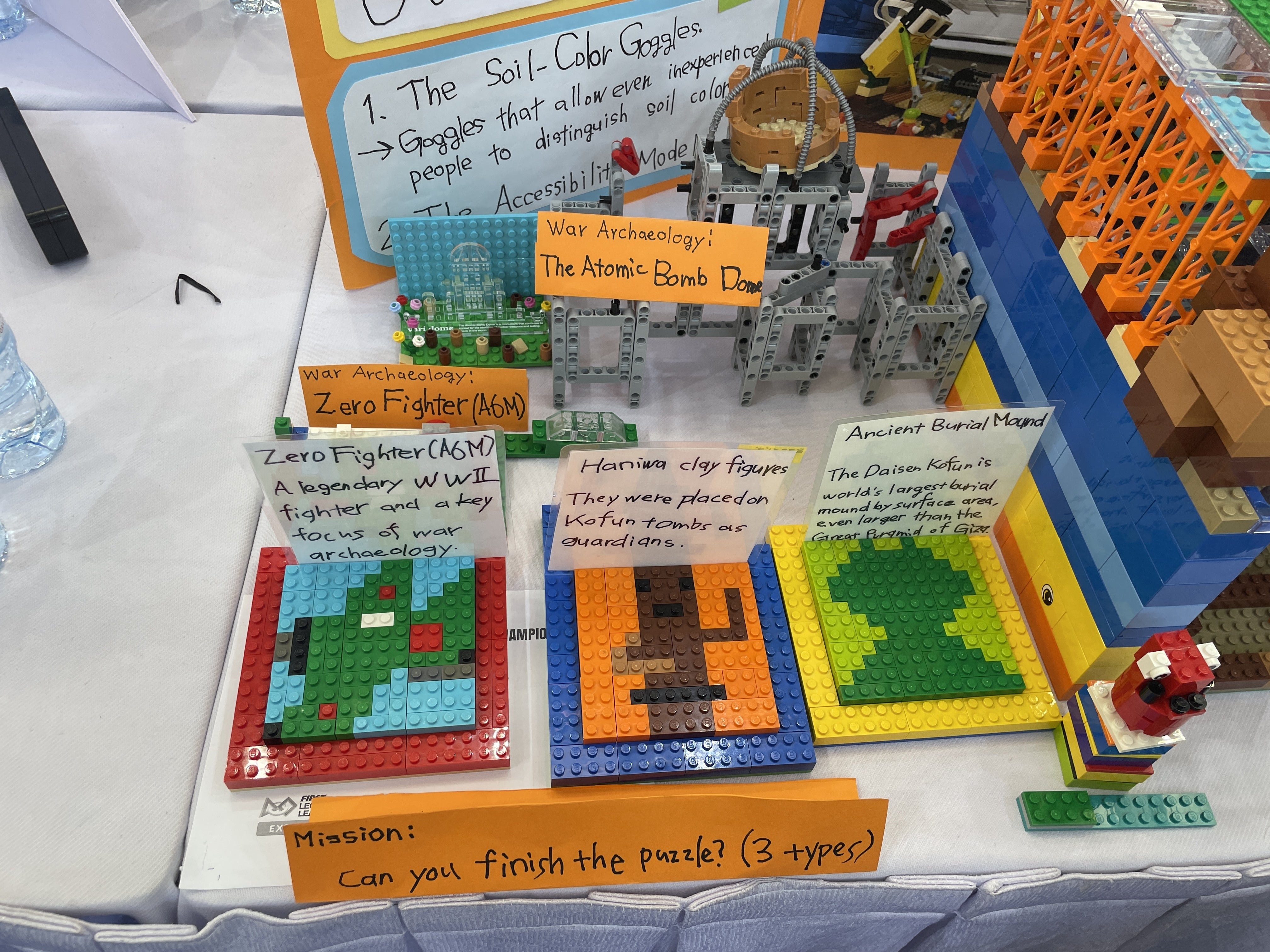 左から零戦(戦争考古学)、はにわ、大山古墳。メンバーが興味を持った考古学をデザインしたよ。広島にフィールドワークに行った後に作った原爆ドームもブースに置いたんだ。