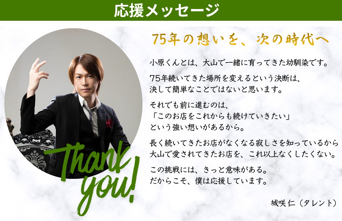 長年にわたり大山園を愛していただいた皆様、そしてこのプロジェクトページをご覧いただいた全ての方に心より感謝申し上げます。お茶を通じて生まれる人と人とのつながりを大切に、新しい大山園でも皆様をお迎えできる日を楽しみにしています。