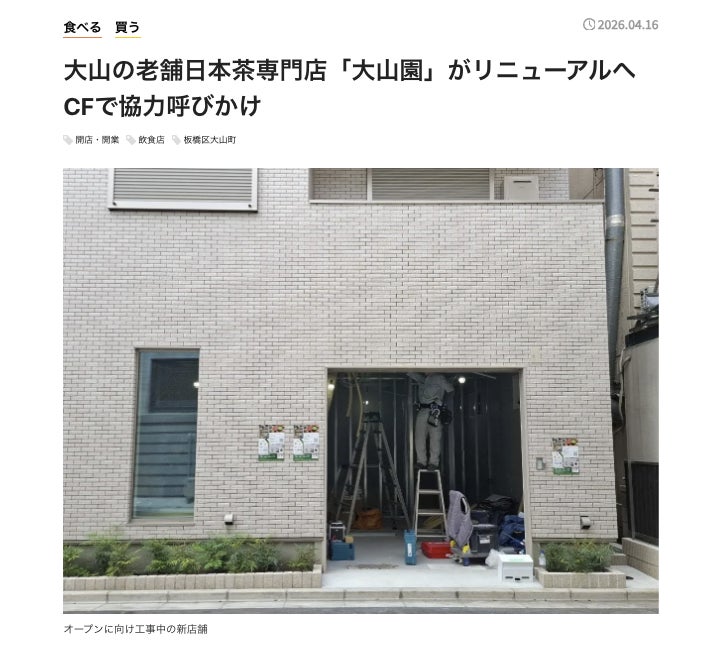 2026/04/18 18:00いつも応援いただきありがとうございます!先日、板橋経済新聞様の記事に取り上げていただきましたので、共有させていただきます。↓↓↓大山の老舗日本茶専門店「大山園」がリニューアルへCFで協力呼びかけ今回の募集期間もまもなく折り返しとなります。新店舗の準備で忙しい毎日ですが、5月11日の募集終了日まで頑張りますので、更なるご支援と拡散にご協力をお願いします! もっと見る