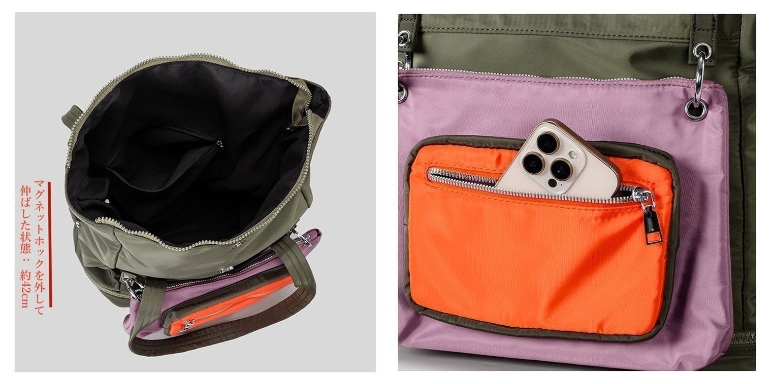 ファスナーを開けるだけで、バッグ全体の高さが数センチ伸び、収納容量が拡大します。
