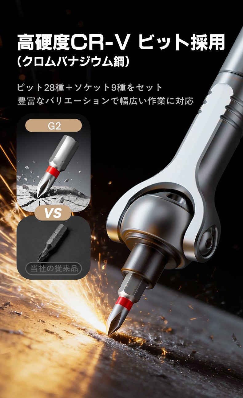 車両整備からDIYまで対応する豊富なビット・ソケットが付属。整理しやすい専用ケース付きで、持ち運びにも便利です。