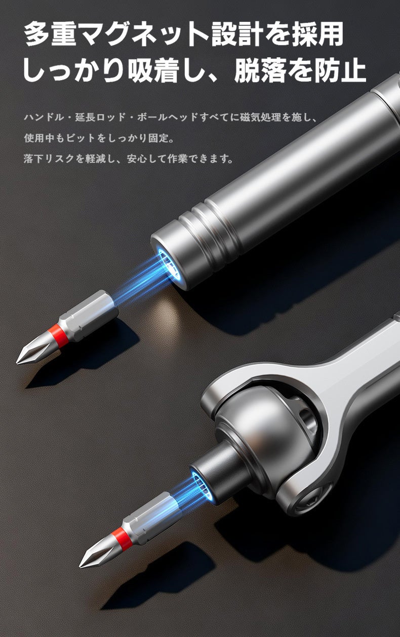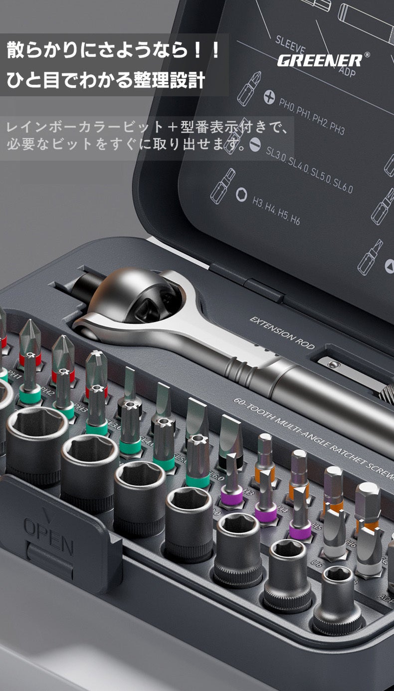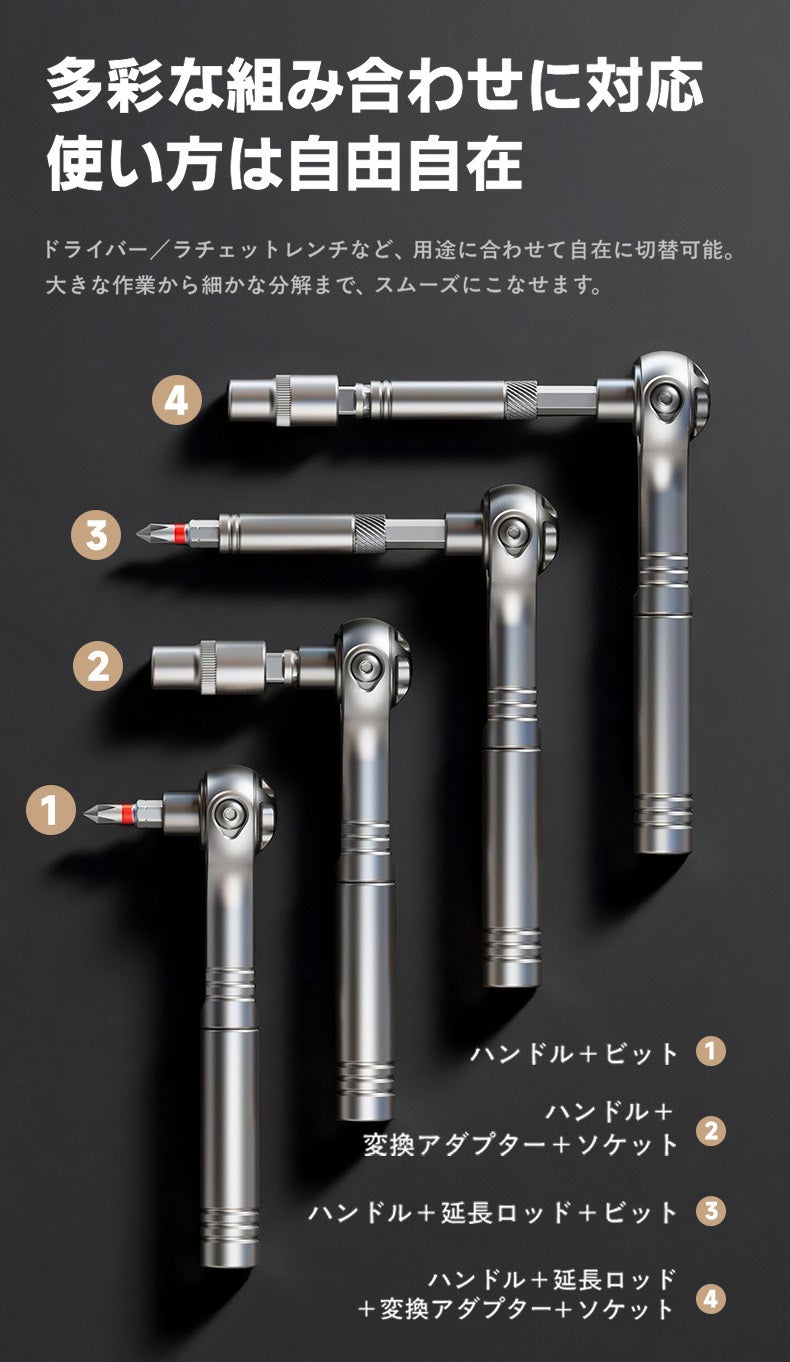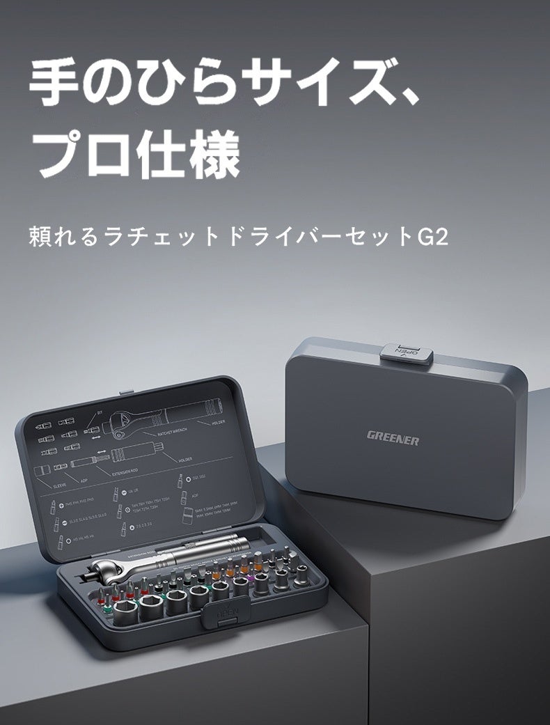 「あと数センチ隙間があれば、、」そんな整備やDIYの悩みを解決!180°調節自在なヘッドと変形ハンドルを搭載した次世代ラチェットドライバーセットG2が登場。高精度60歯ギアが狭所での微細な作業を可能にします。強度を誇るCR-V鋼ビットを28種揃え、自転車から精密機器までこれ一箱で一生寄り添う相棒に。