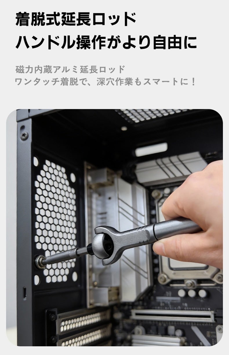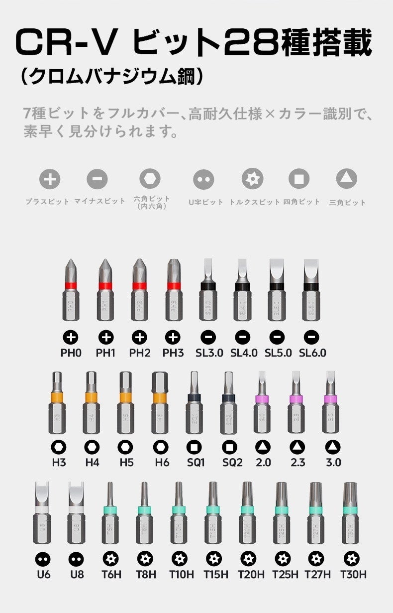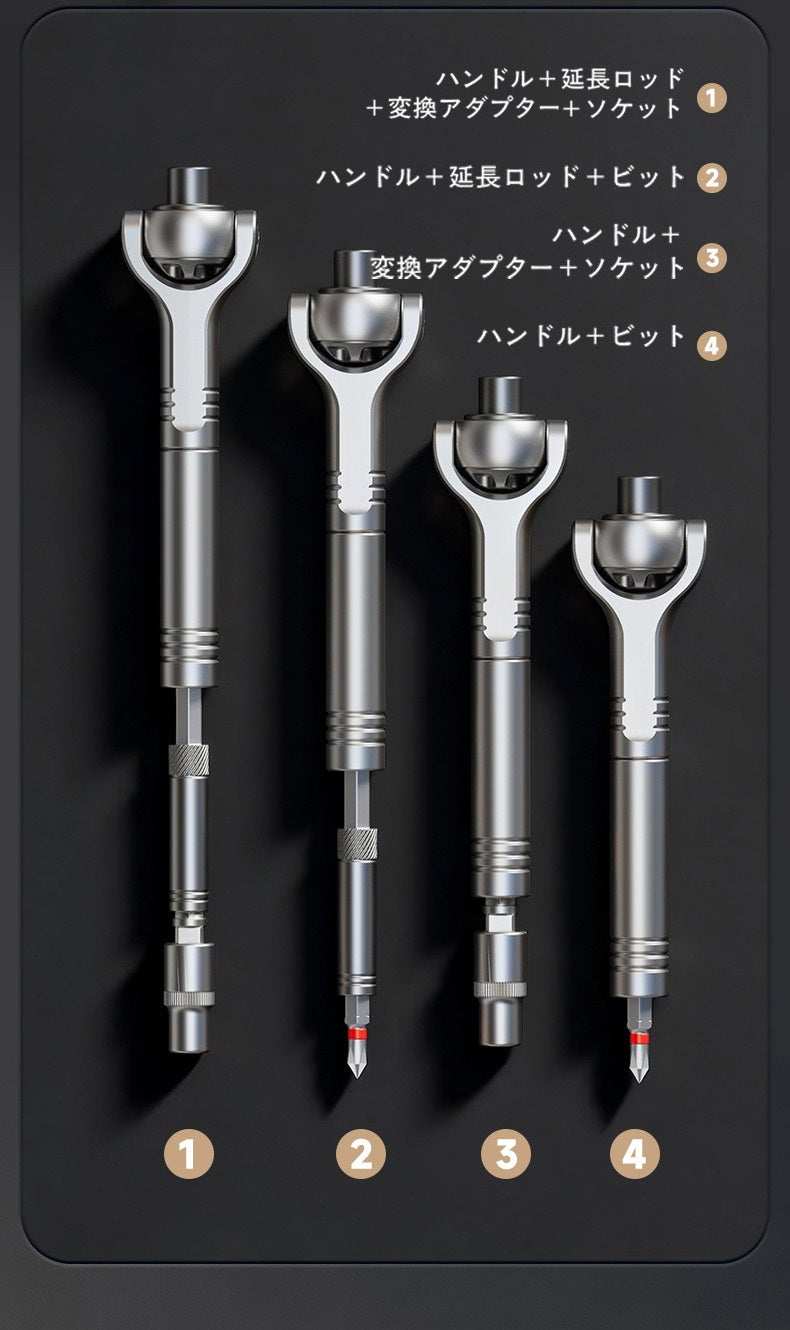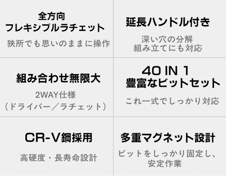 「あと数センチ隙間があれば、、」そんな整備やDIYの悩みを解決!180°調節自在なヘッドと変形ハンドルを搭載した次世代ラチェットドライバーセットG2が登場。高精度60歯ギアが狭所での微細な作業を可能にします。強度を誇るCR-V鋼ビットを28種揃え、自転車から精密機器までこれ一箱で一生寄り添う相棒に。
