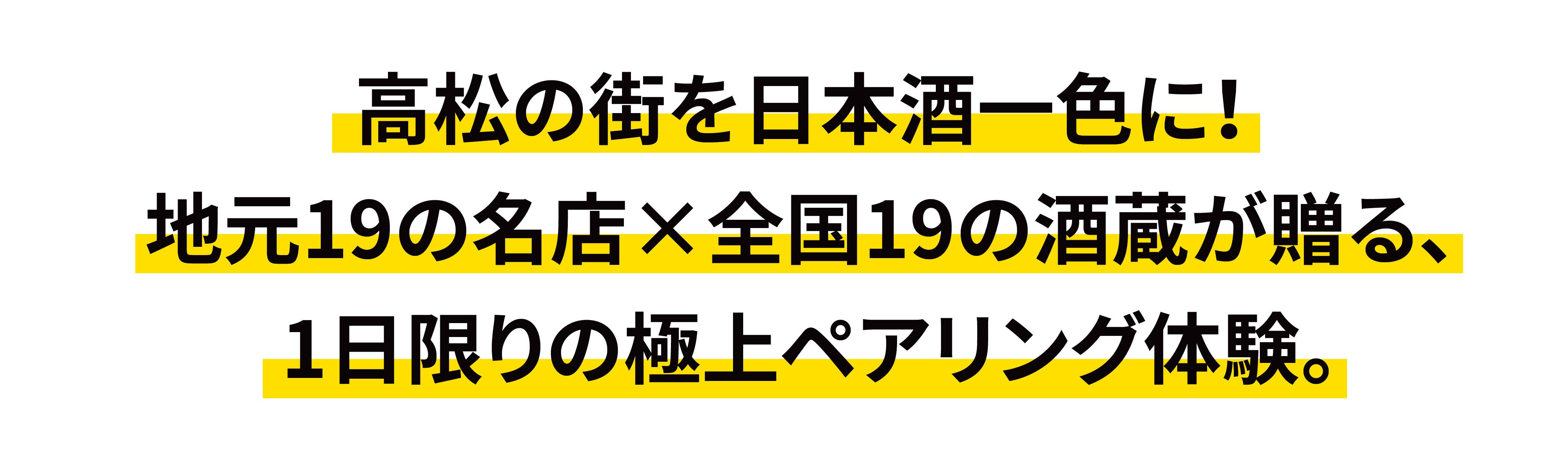 高松の街を日本酒で染め上げ、地元19店舗と全国の19蔵がタッグを組んだ最高の体験を提供します。 日本酒文化の継承と地域活性化を応援し、飲食を通じて次世代へ伝える挑戦にご参加ください。