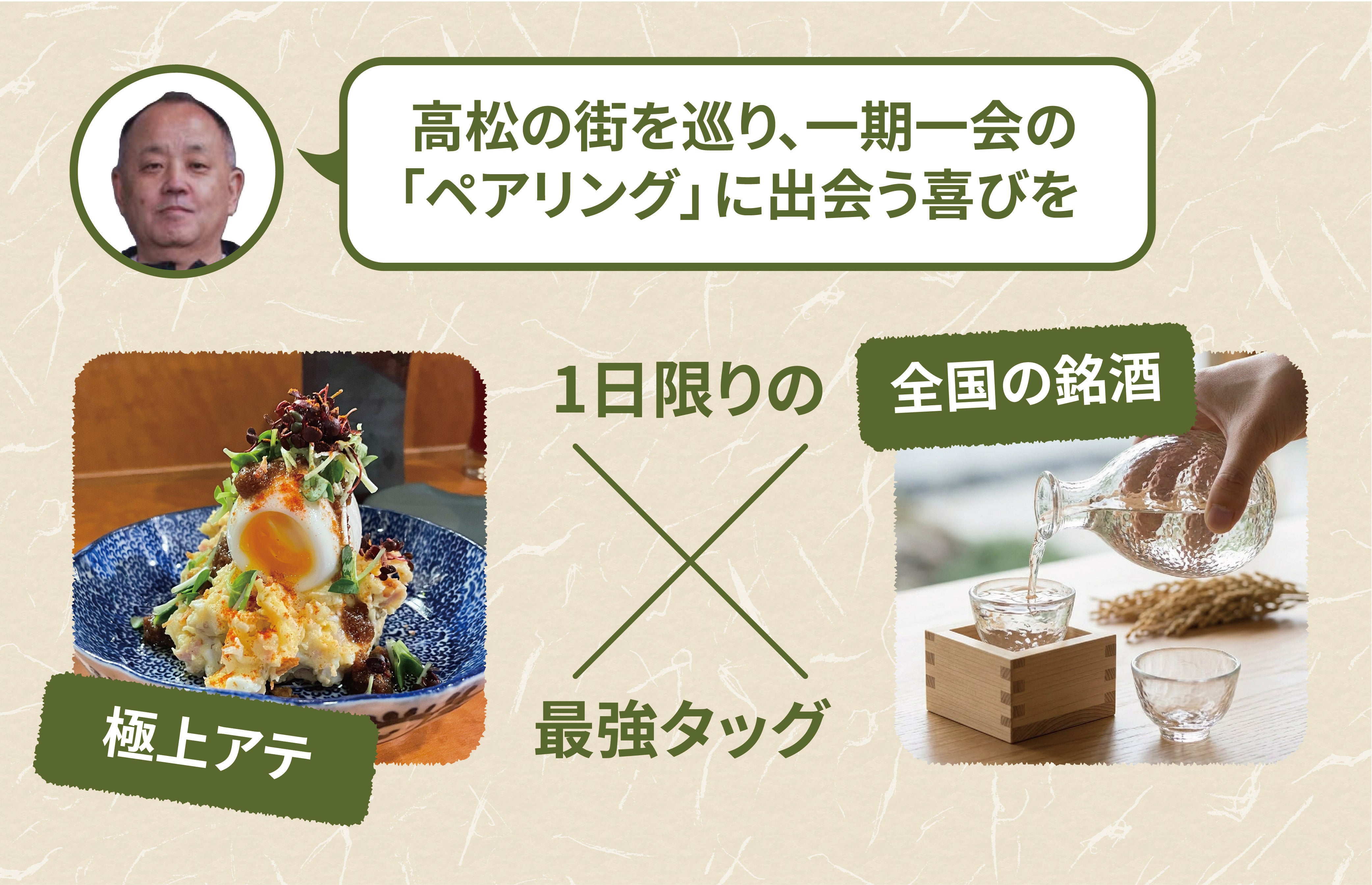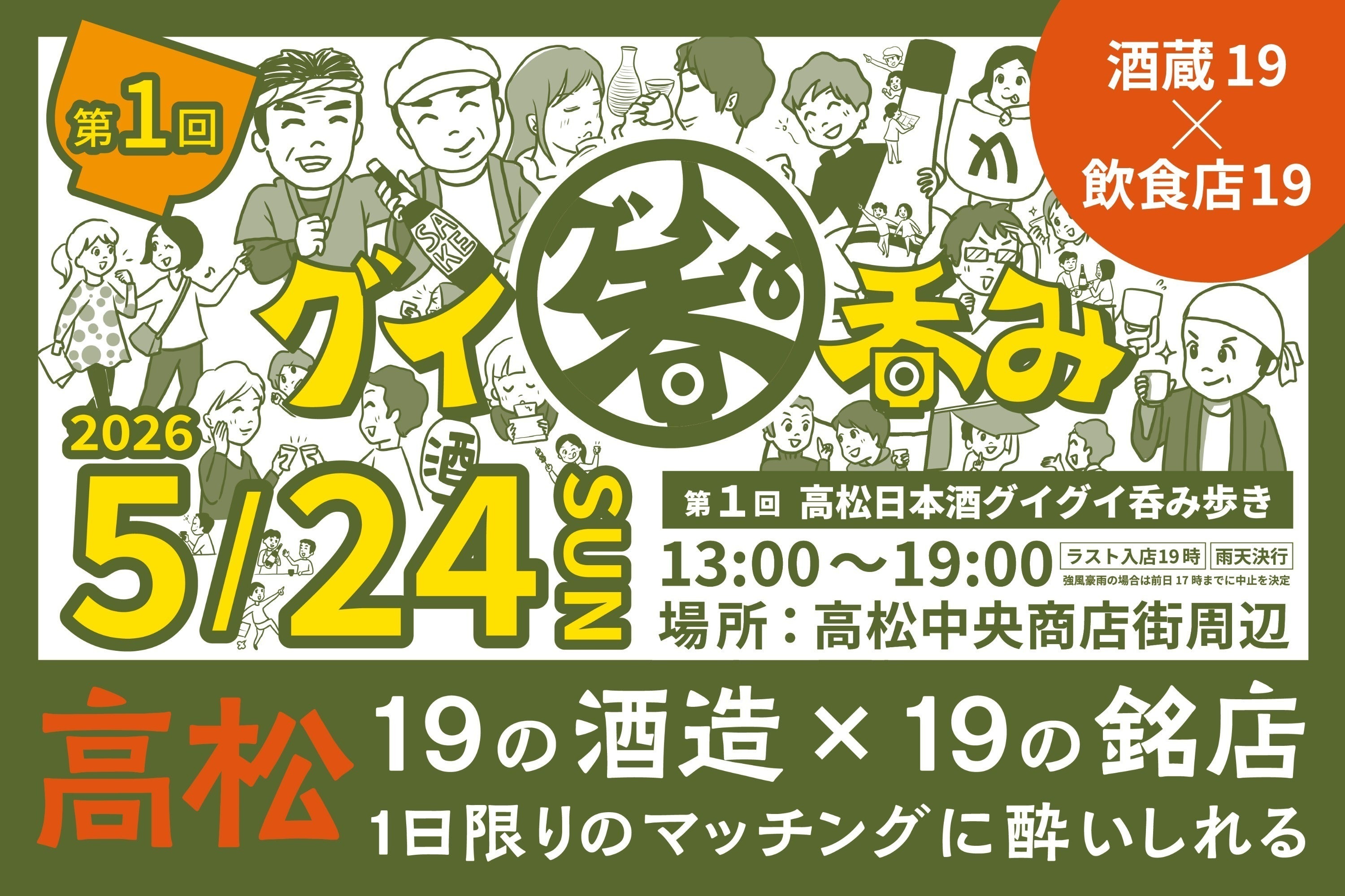 5月24日、高松の街を日本酒で染め上げる一大呑み歩きイベントを開催します!地元の名店19店舗が腕を振るう「自慢のアテ」と、全国から集結する19の蔵元が織りなす最高のペアリング体験。日本の伝統的な酒造りの「ユネスコ無形文化遺産」登録を機に、改めて国酒の魅力を体感していただくためのプロジェクトです。高松の飲食を通じた地域活性化と、日本酒文化の次世代への継承を目指す私たちの挑戦に、ぜひサポーターとしてご参加ください!