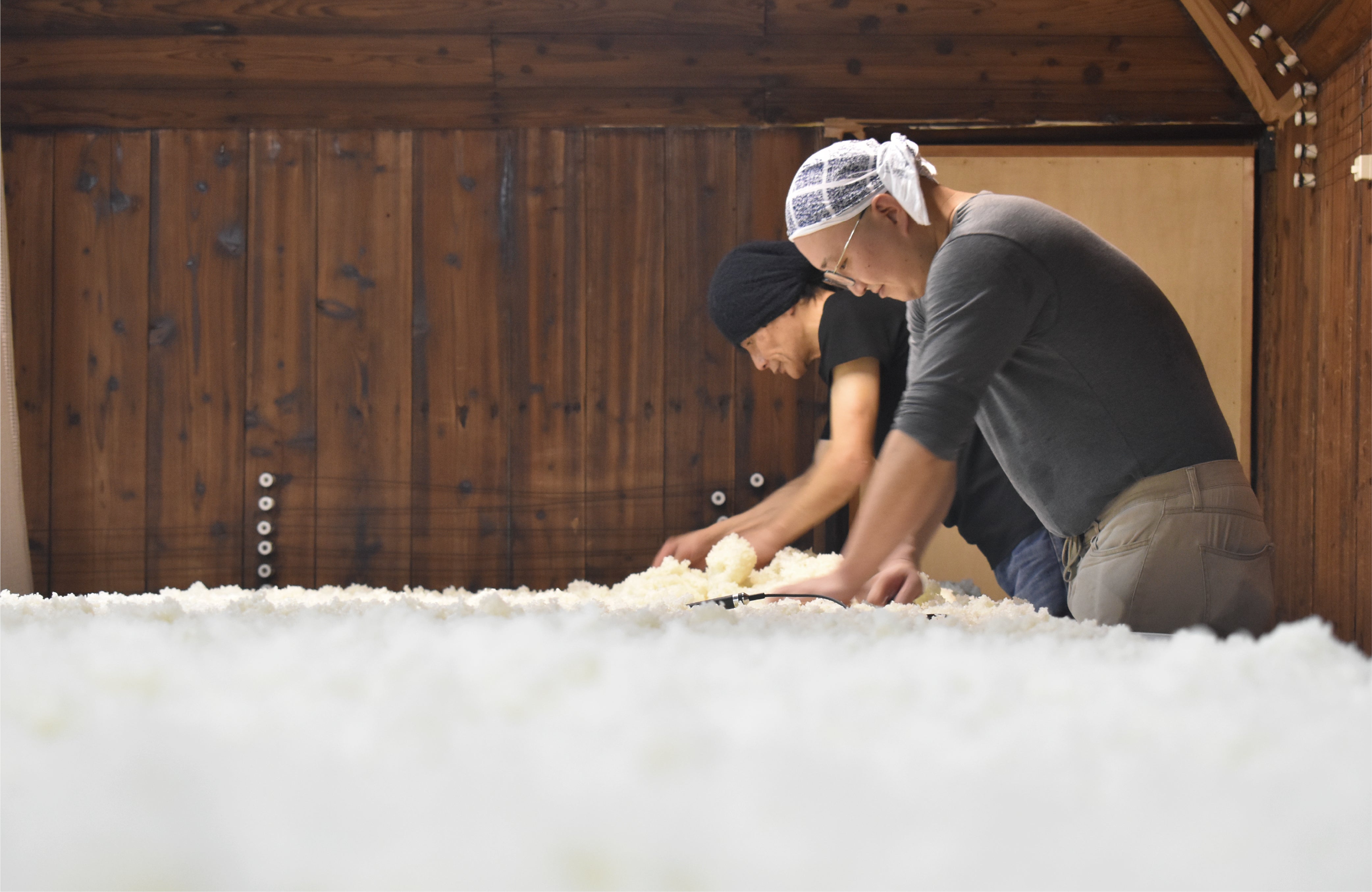 香川県川鶴酒造にて、蒸して冷ました米に麹菌を振る日本酒づくりの重要な「種切り」工程