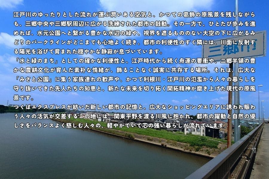 江戸川の流れと二郷半領の歴史が交差する躍動の街・三郷。雄大な筑波山のシルエットを遠くに仰ぐ水辺の風景と、みさと公園の豊かな緑、そしてつくばエクスプレスが繋ぐ都心近接の利便性が息づく埼玉県三郷市。「万葉遺跡」をはじめとする古の残り香と、日本一の読書のまちとして育まれてきた知的文化は、訪れる人々を魅了しています。