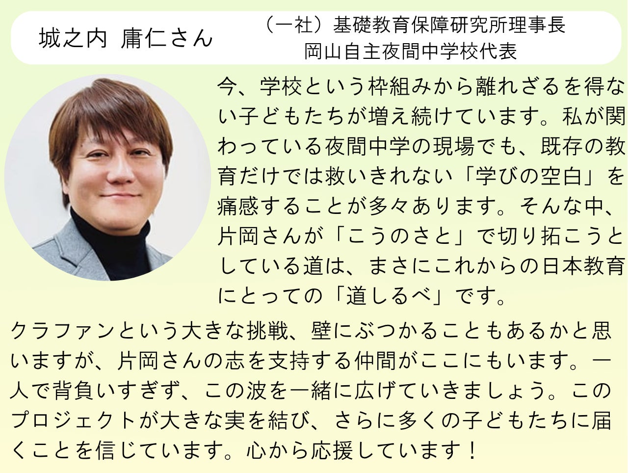 岡山自主夜間中学校代表 城之内 庸仁さんからの応援メッセージ