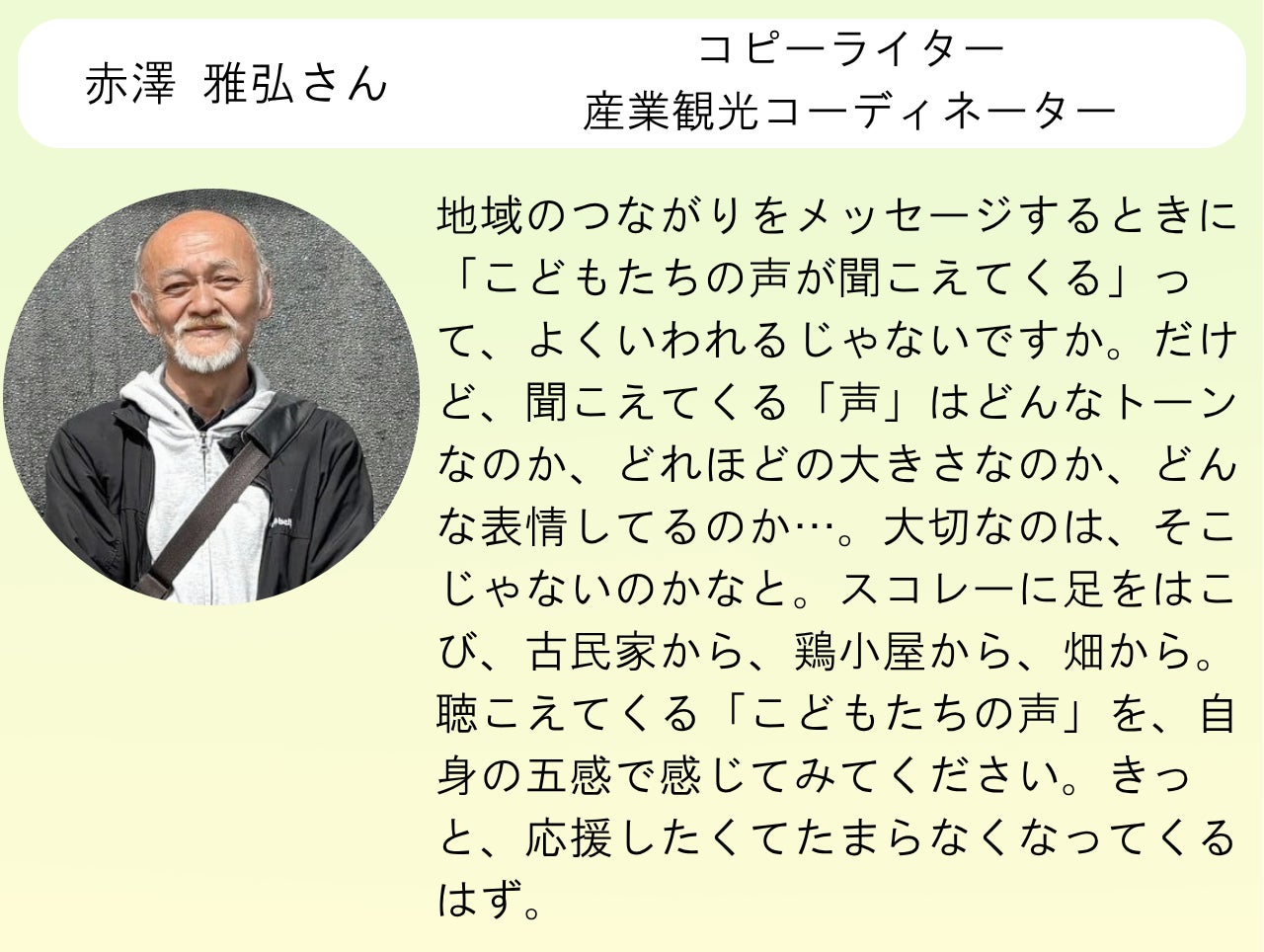 2026/04/25 07:00いつも応援ありがとうございます。岡山県倉敷市玉島を拠点にコピーライター、産業観光コーディネーターをされている赤澤雅弘さんに応援メッセージをいただきました。「地域のつながりをメッセージするときに「こどもたちの声が聞こえてくる」って、よくいわれるじゃないですか。だけど、聞こえてくる「声」はどんなトーンなのか、どれほどの大きさなのか、どんな表情してるのか…。大切なのは、そこじゃないのかなと。スコレーに足をはこび、古民家から、鶏小屋から、畑から。聴こえてくる「こどもたちの声」を、自身の五感で感じてみてください。きっと、応援したくてたまらなくなってくるはず。___________赤澤さんは、スコレーに来てくれたときに、「懐かしい場所じゃなぁ」とおっしゃっていただきました。古民家、鶏、里山、そして、子どもたちの遊ぶ声、それらが一体となっているスコレーの魅力を応援メッセージに込めてくれました。赤澤さん、どうもありがとうございます!スコビレッジ関連情報5月2日(土)にニホンミツバチの巣箱づくりワークショップを開催します。詳細は下のリンクからご確認ください。・ニホンミツバチ巣箱づくりワークショップ、里山で学ぶミツバチのお話シェアで応援よろしくお願いしますおかげさまで30%を達成することができました。まだまだ道のりが遠いですが、皆さんからの応援を背に受けてがんばっていきます!・子どもたちの未来を明るく こうのさと代表片岡の想い facebookhttps://x.gd/c5qHC・クラファンページはこちらhttps://camp-fire.jp/projects/932976/preview引き続き応援よろしくお願いします。 もっと見る
