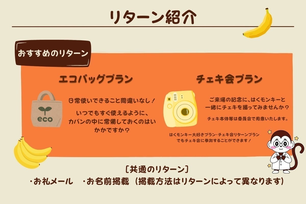 クラウドファンディング限定のアクリルキーホルダーやエコバッグがもらえる「アクリルキーホルダープラン」「エコバッグプラン」や、はくモンキーと実際に一対一でチェキを撮ることができるプランもオススメとなっています!