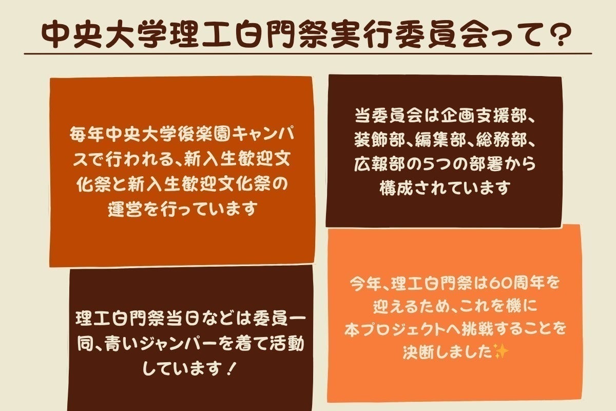 こんにちは!中央大学理工白門祭実行委員会です。私たちは中央大学後楽園キャンパスで開催される新入生歓迎文化祭と理工白門祭を運営している学生団体です。