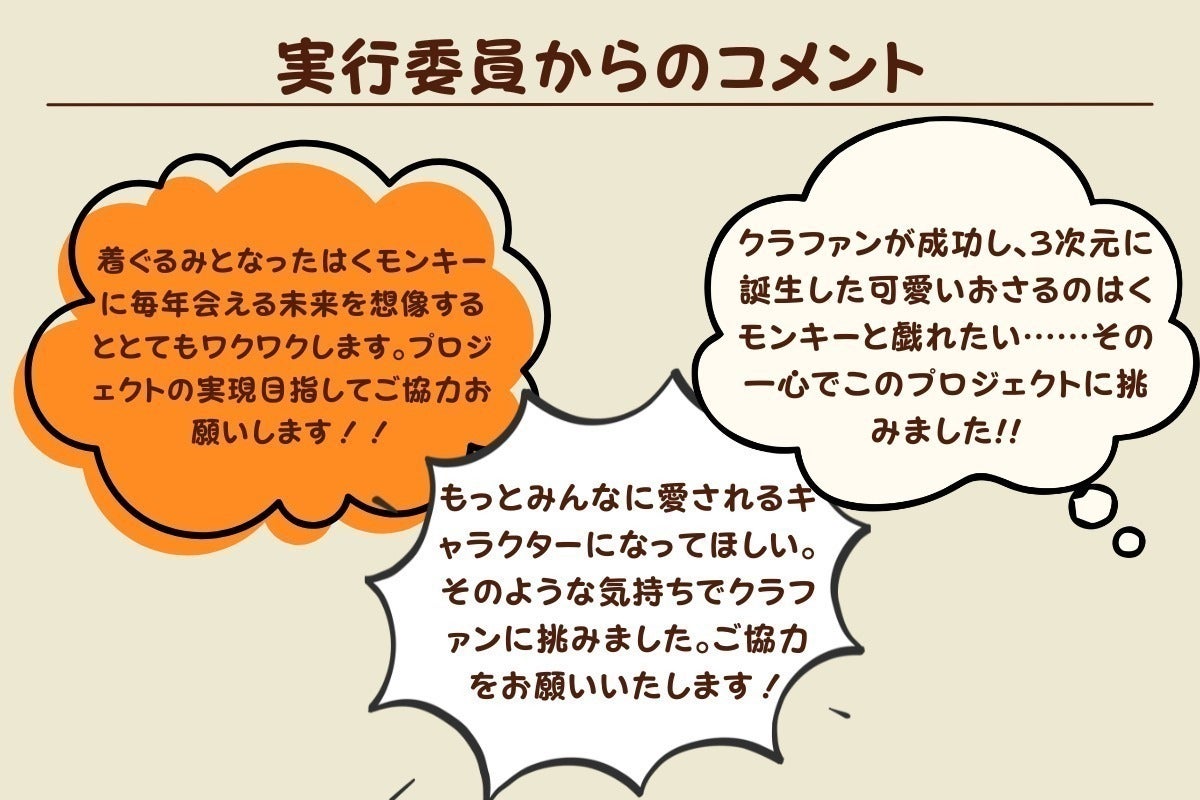 ですが、このプロジェクトは私たち学生だけでは実現不可能なものです。だからこそ、「はくモンキー」の着ぐるみ化をみなさんの応援という力をお借りすることで実現させてください。