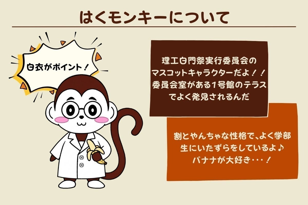 そんな理工白門祭には、「はくモンキー」という公式マスコットキャラクターがいます。私たちはこの「はくモンキー」を、理工白門祭を象徴する存在として、より多くの方に親しんでいただきたいと考えてきました。多摩キャンパスの白門祭にはすでに多くの人に親しまれているキャラクターが存在する中で、理工白門祭にも来場者の皆さまに愛され、記憶に残るようなシンボルとなる存在が必要だと感じていたからです。