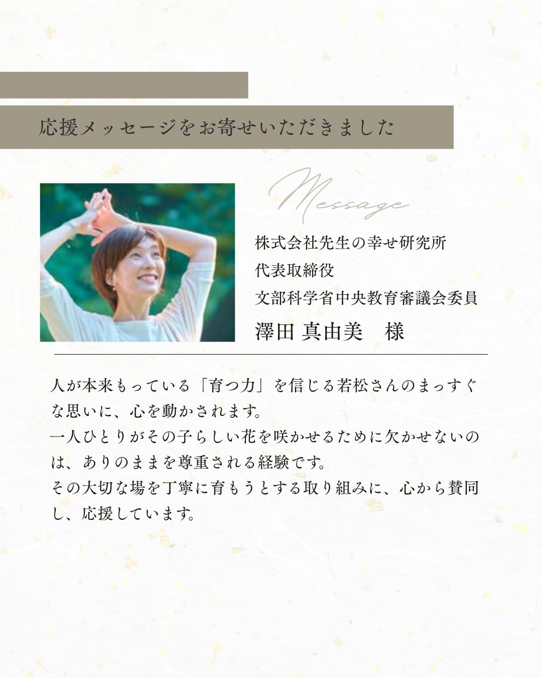 2026/03/26 18:32代表の若松がみなさまへお伝えしたい想いを、サポートチームのメンバーがステキな動画に仕上げてくれました!どうぞご覧ください。またお寄せいただきました応援メッセージも、追加いたしました。先にご紹介した澤田真由美さんに加えてペップティーチャー代表 乾倫子さま東京都公立小学校教員 岸名祐治さまやまなみ工房施設長 山下完和さま株式会社地域環境計画研究所 若狭健作さまどうもありがとうございました。 もっと見る
