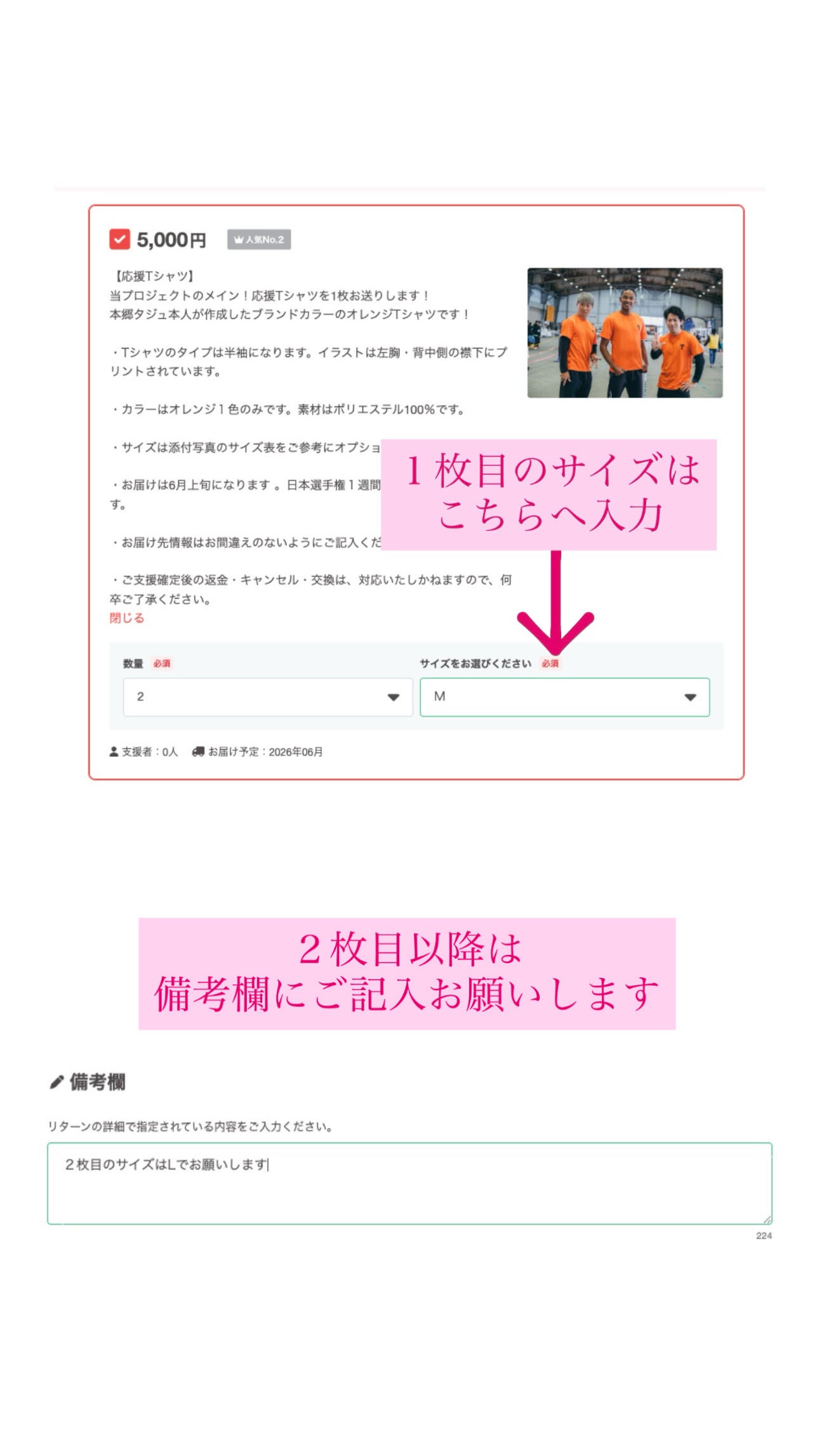 • メインリターンである「応援Tシャツ(5000円)」や「親子応援Tシャツプラン(7000円)」など、同じリターンを同時に2個以上お選びいただく際は、2枚目以降のサイズを備考欄にご記入ください!※親子プランの子どもにお渡しするTシャツサイズは、SSサイズ固定になりますので、ご了承ください。よろしくお願いします! もっと見る
