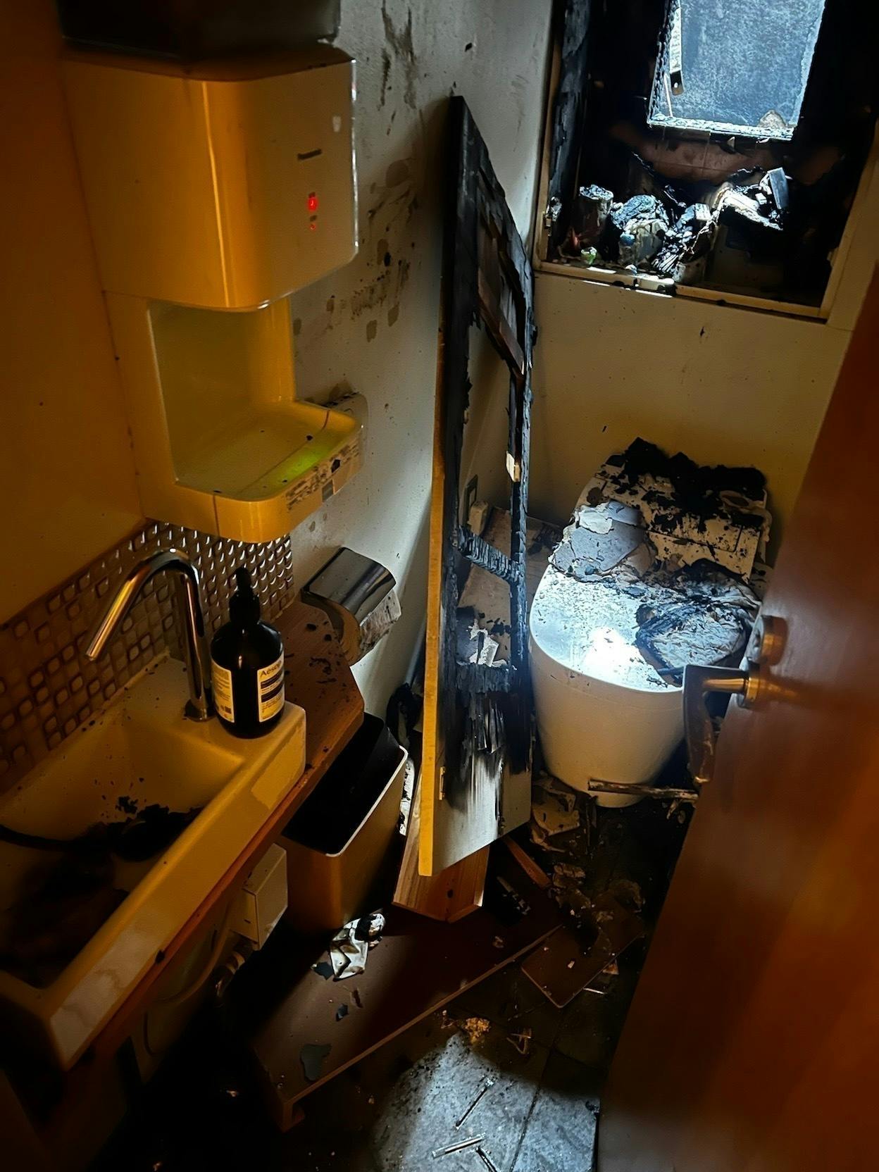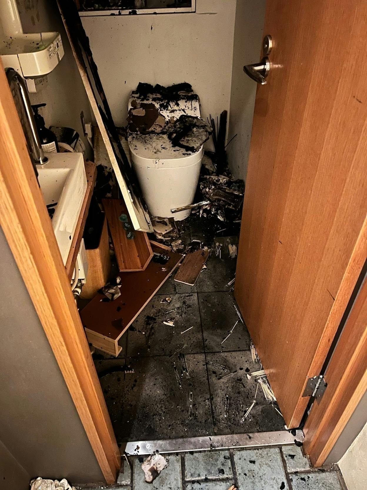 壁は黒くなり、トイレは燃え、床は水浸し。