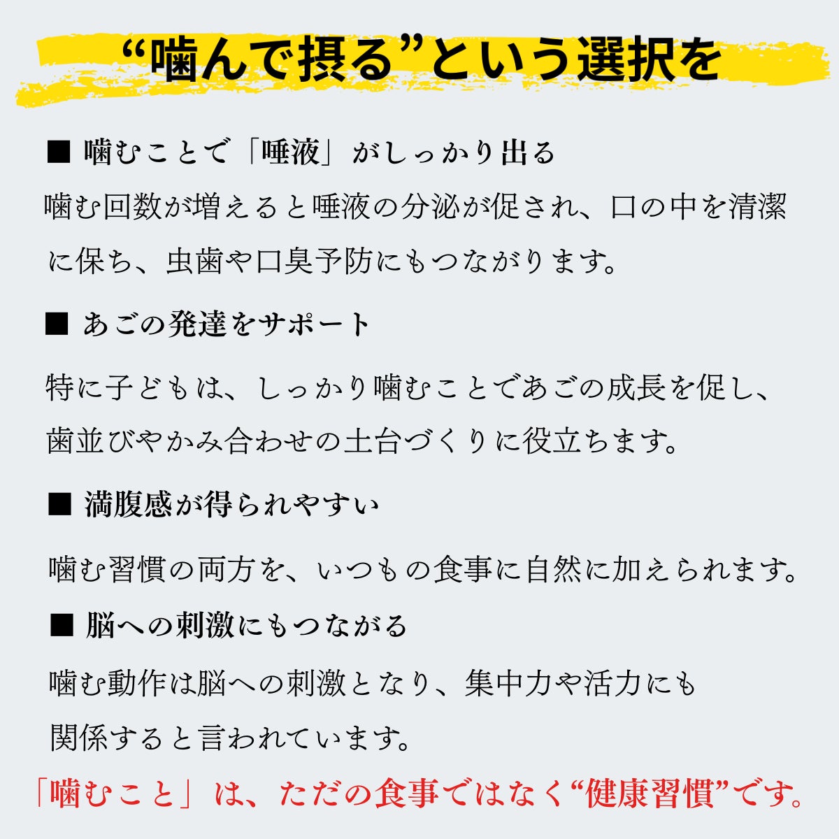 さらにサクサクとした食感で「噛む」ことも自然に増えます。よく噛むことで脳の血流が高まり、集中力や思考を司る前頭前野が活発になることが研究でも報告されています。実際、現代の子どもたちの噛む回数は戦前と比べて半分以下になっていると言われています(戦前:約1,400回/食 → 現代:約600回/食)。