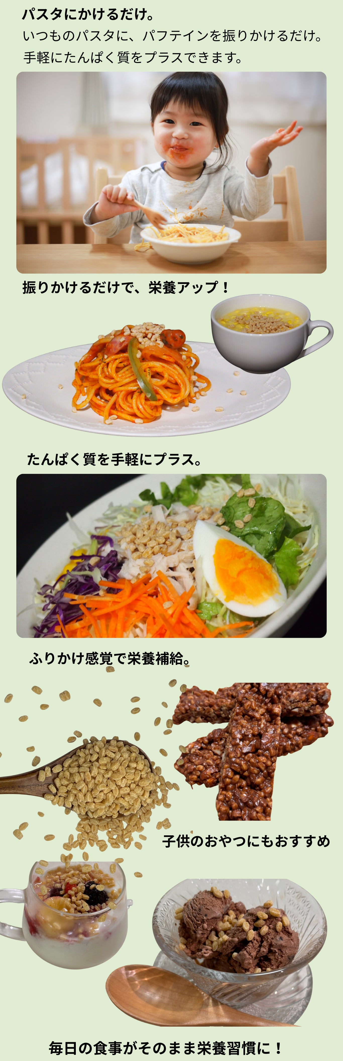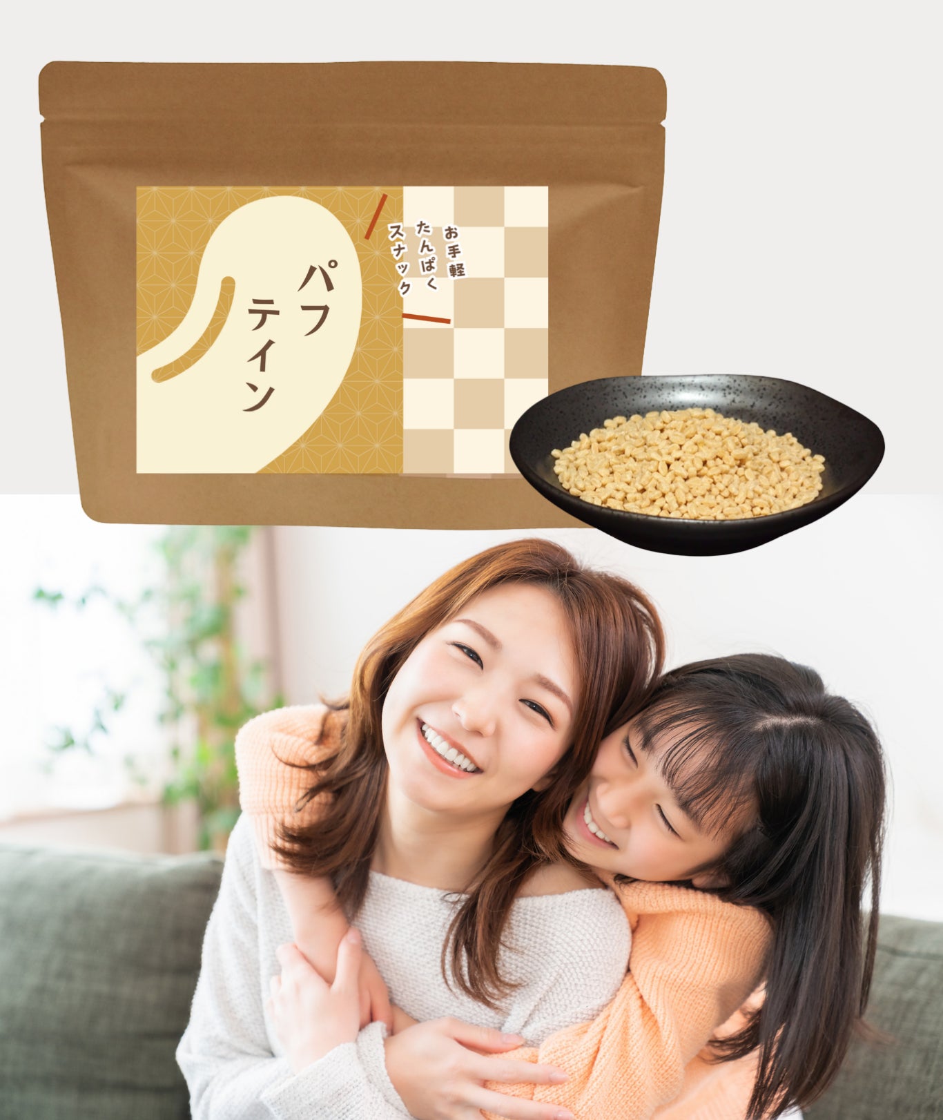 毎日の食事を完璧に整えることは簡単ではありませんが、小さな工夫を積み重ねることで、家族の栄養はしっかり支えることができます。パフテインは、たんぱく質を補いながら、噛む習慣も食卓に取り戻す食品です。大さじ1でたんぱく質約4g。いつもの食事にふりかけるだけで、家族の栄養を手軽にプラスすることができます。