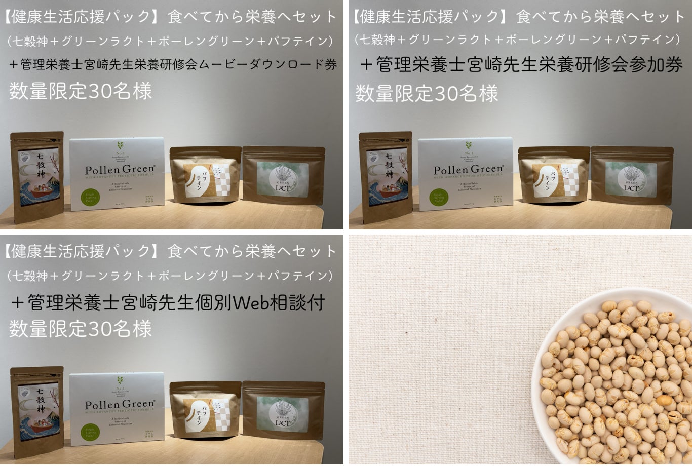 32,400円 食べてから栄養へセット(七穀神+グリーンラクト+ポーレングリーン+パフテイン)+管理栄養士宮崎先生栄養研修会ムービーダウンロード券「※詳細は後日ご案内いたします」