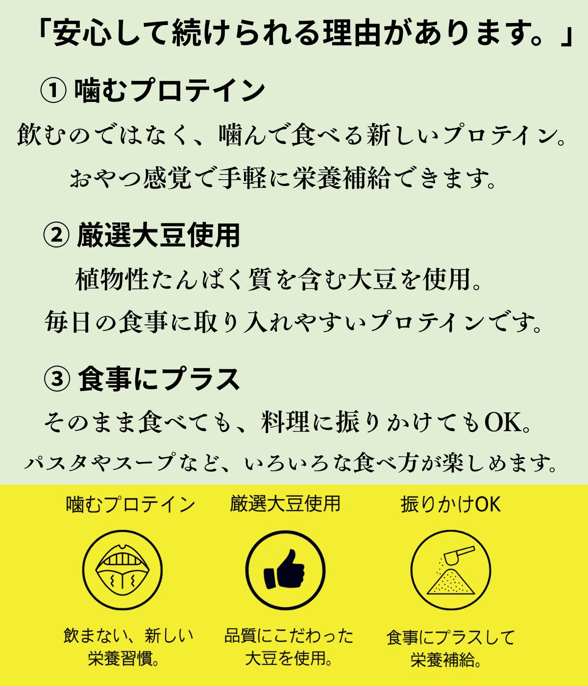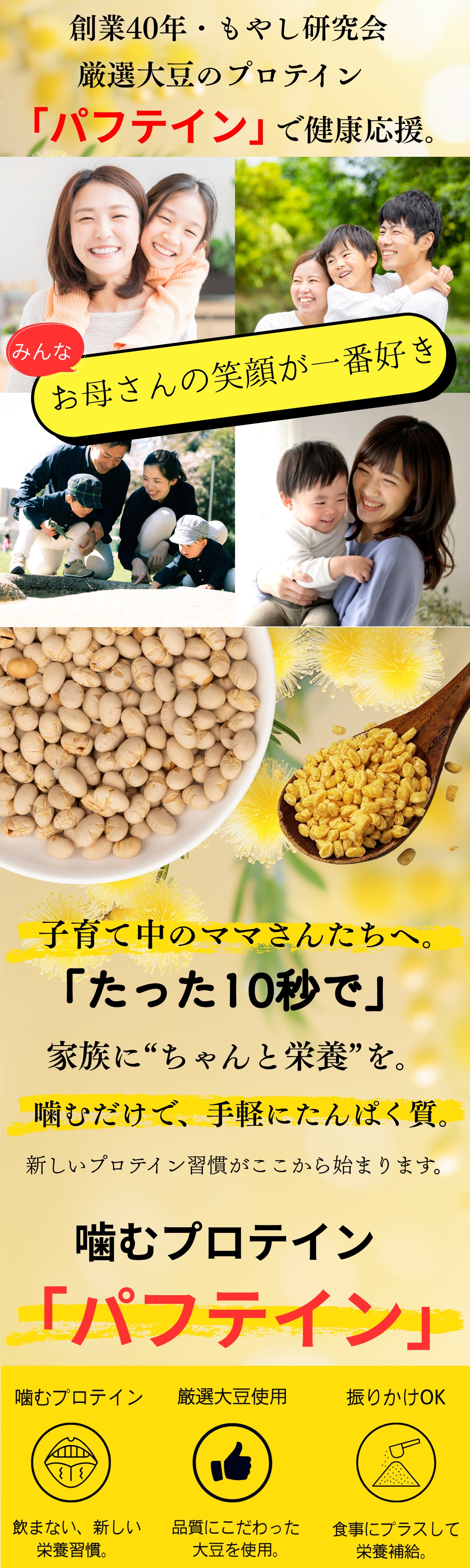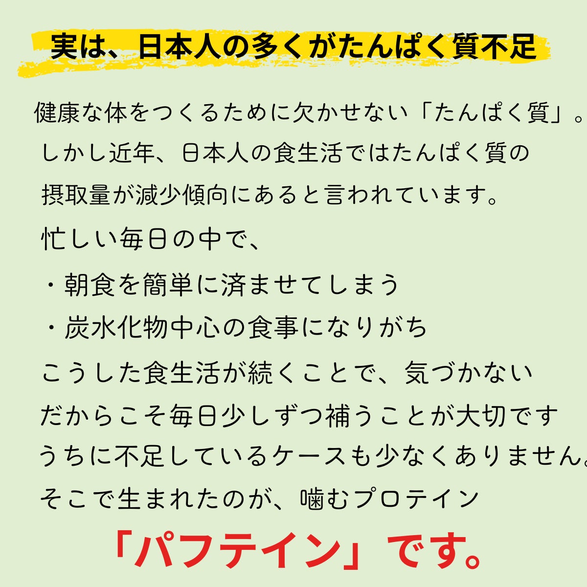 毎日の食事を完璧に整えることは簡単ではありませんが、小さな工夫を積み重ねることで、家族の栄養はしっかり支えることができます。パフテインは、たんぱく質を補いながら、噛む習慣も食卓に取り戻す食品です。大さじ1でたんぱく質約4g。いつもの食事にふりかけるだけで、家族の栄養を手軽にプラスすることができます。