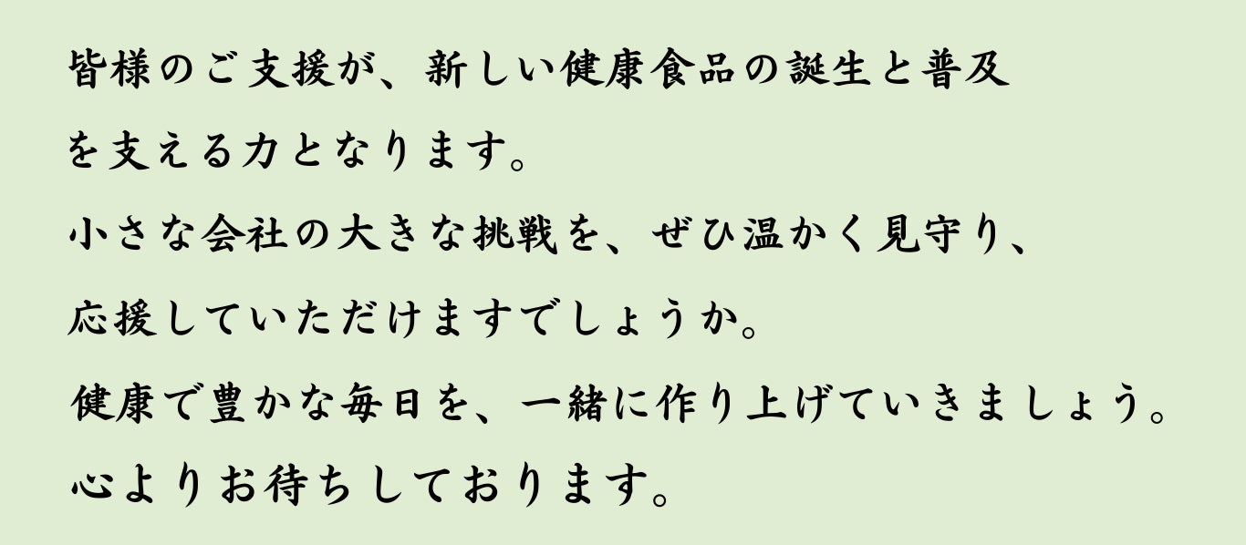 【パフテイン】を通じて、より多くの方が手軽に健康管理ができる社会を実現したいと考えています。植物性プロテインの新しい可能性を提示し、健康的なライフスタイルをサポートする商品として、皆様の日常に寄り添える存在になりたいのです。これまでの健康食品業界の常識にとらわれず、本当に必要とされる商品を作ることで、健康志向の方々のニーズにお応えしたいと思っています。